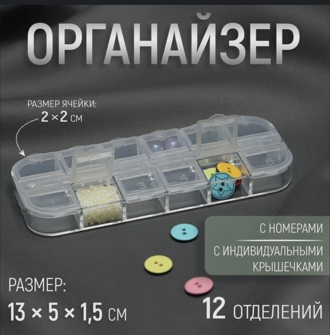 Отзывы на Органайзер для рукоделия, для бисера, пуговиц, таблеток, страз, для декора,12 отделений с номерами, цвет прозрачный