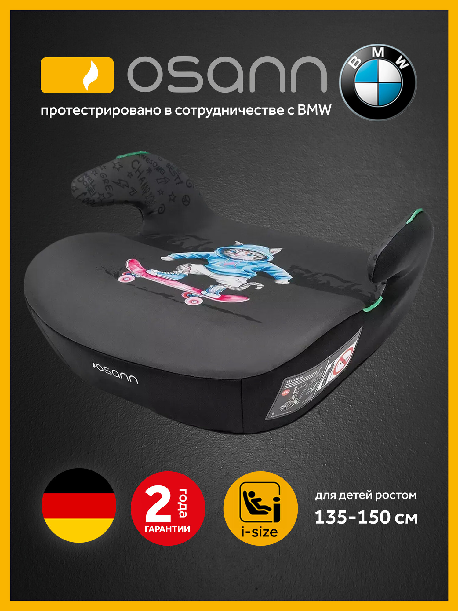 Автокресло детское Osann - BMW бустер Boost Cat, группа 3, от 135 до 150 см, черно-серый с котом информация: