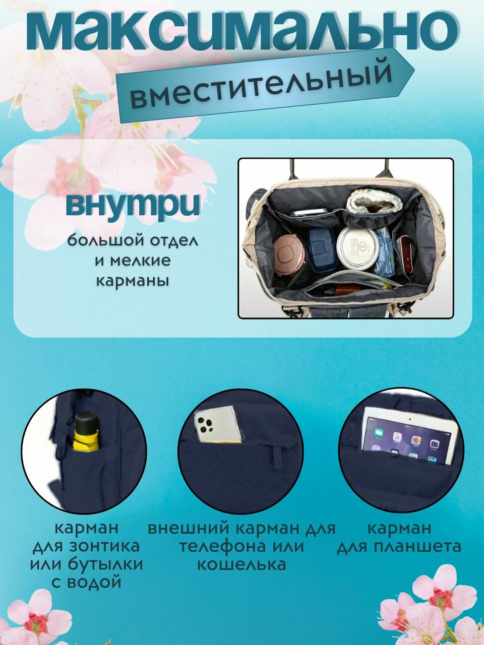 Отзывы на Женский универсальный городской рюкзак для мамы / Дорожная сумка + аксессуар для мелочей синий