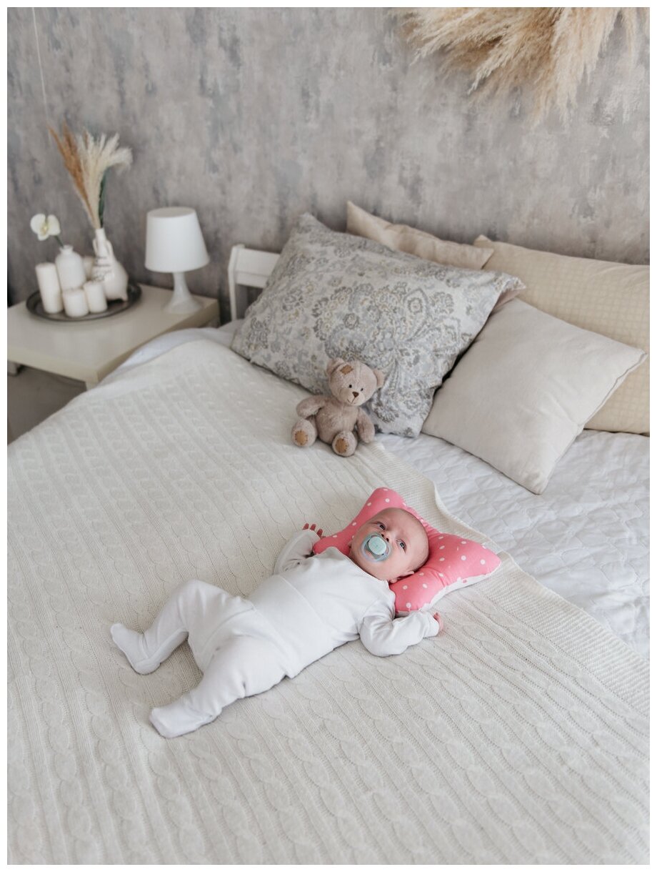 Подушка ортопедическая для малышей BIO-TEXTILES "малютка" Горошки розовые 22*29 с искусственным лебяжьим пухом анатомическая новорожденным под шею информация: