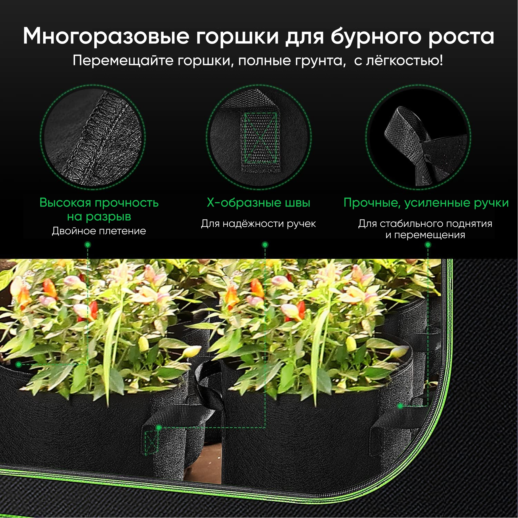 Отзывы на Чёрный Плотный Тканевый Мешок Горшок с ручками, 35л, 5 штук (гроубег, гроубэг), для растений и цветов