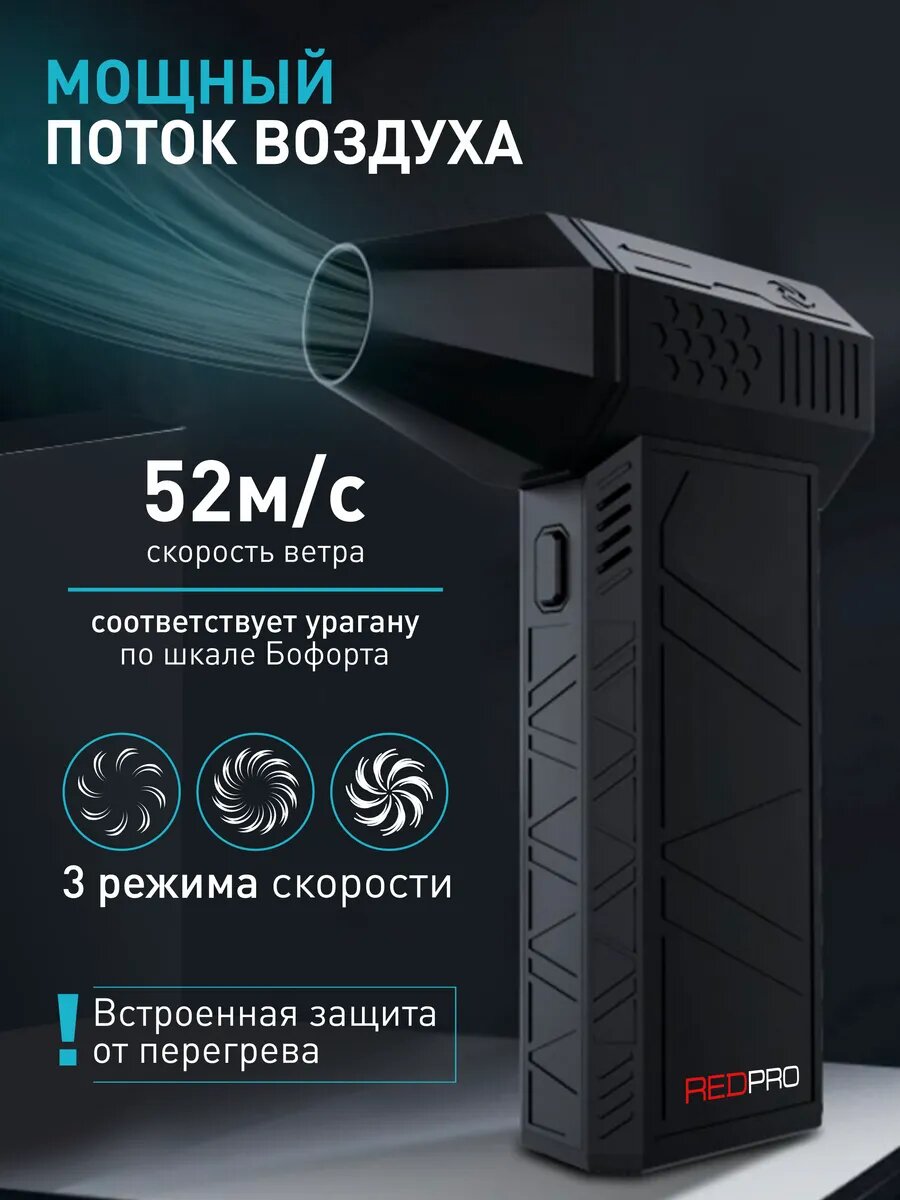 Аккумуляторная воздуходувка REDPRO 3 режима работы, для авто и ПК, Li-Ion, 52 м/с, 130000 об/мин, бесщеточный двигатель информация: