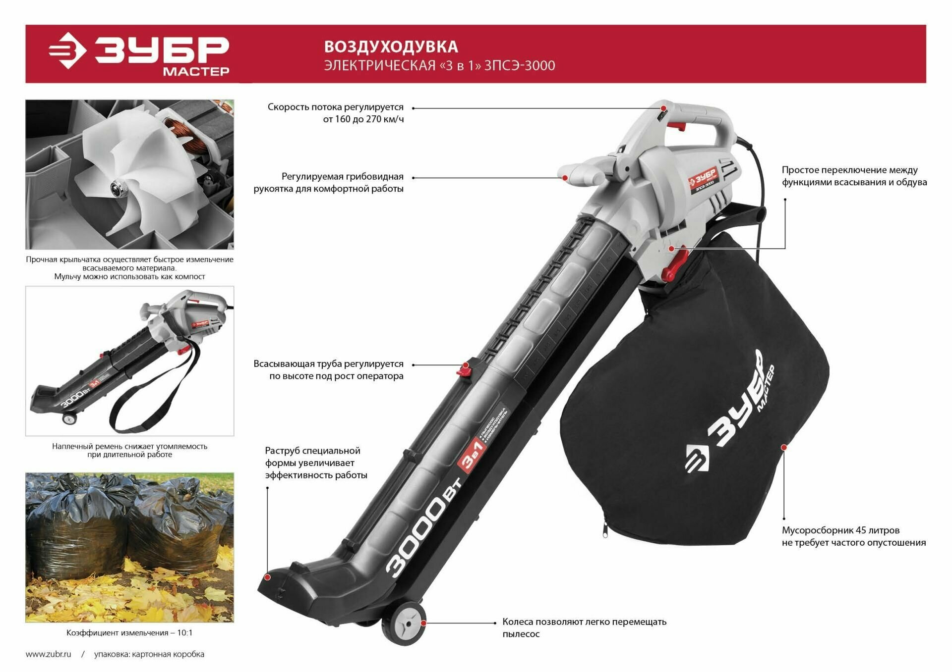 Садовый пылесос воздуходувка электрическая Зубр ЗПСЭ-3000 с измельчителем информация: