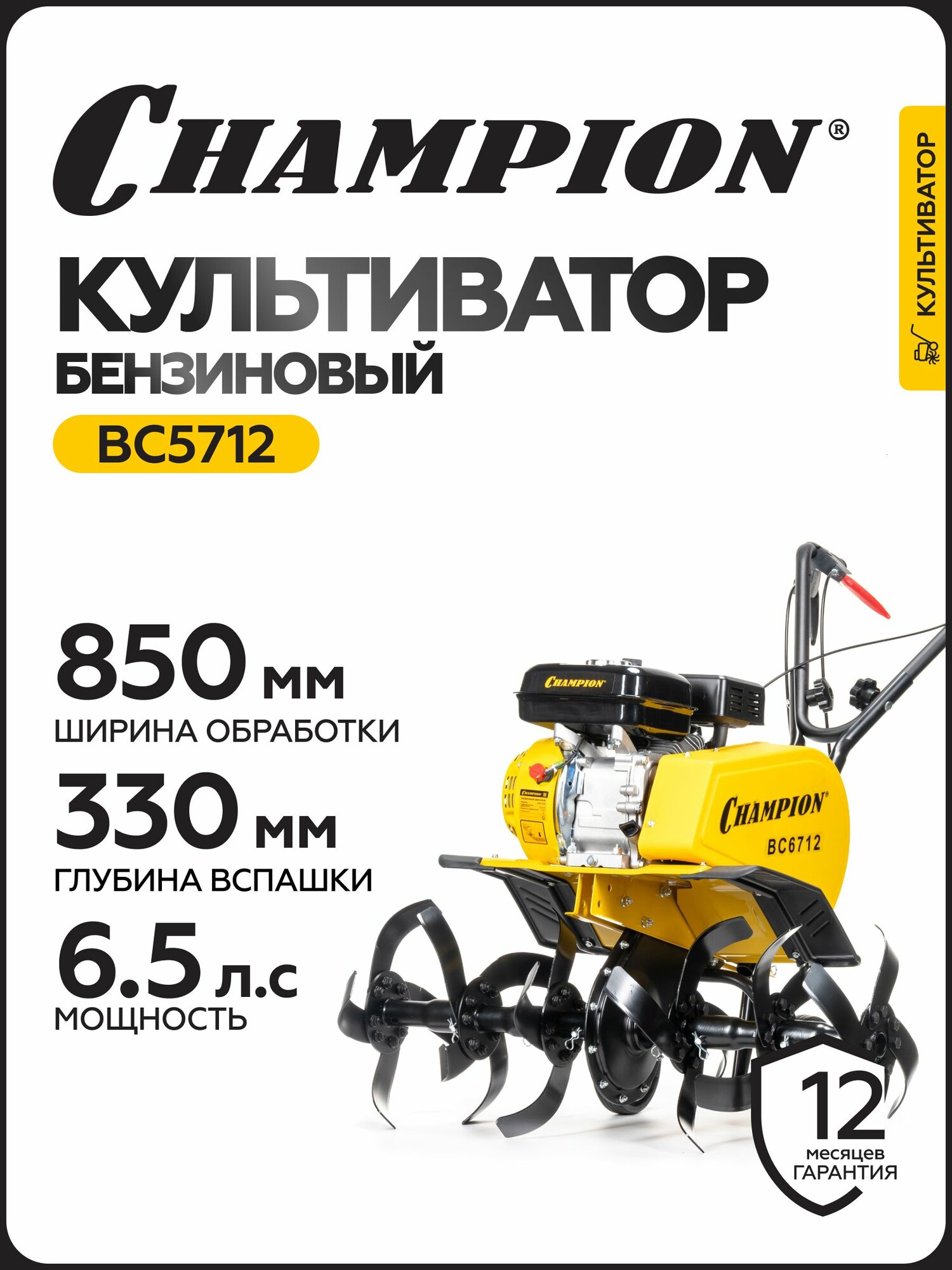 Культиватор бензиновый CHAMPION ВC5712, 4,8 кВт, D 33 см, 30-55-85 см информация: