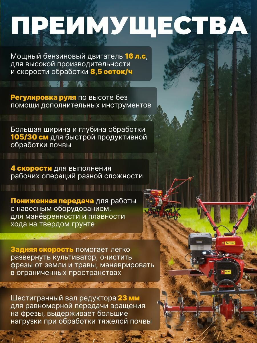 Культиватор бензиновый FERMER FM-1617MXL, колеса 6.50-12, 16 л. с, ширина обработки 105 информация: