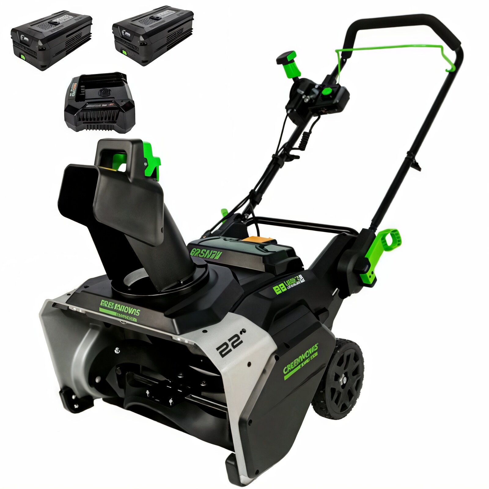 10 цен на Снегоуборщик аккумуляторный Greenworks 82SN22 82V, бесщеточный, ширина захвата 56 см, высота захвата 32 см, комплект 2 АКБ 5 Ач + быстрое ЗУ
