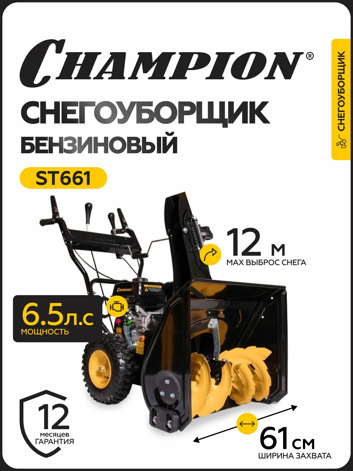 Снегоуборщик CHAMPION ST661 (6,5лс 61см 4F/1R колеса 3,6л 61,5кг руч. стартер) информация:
