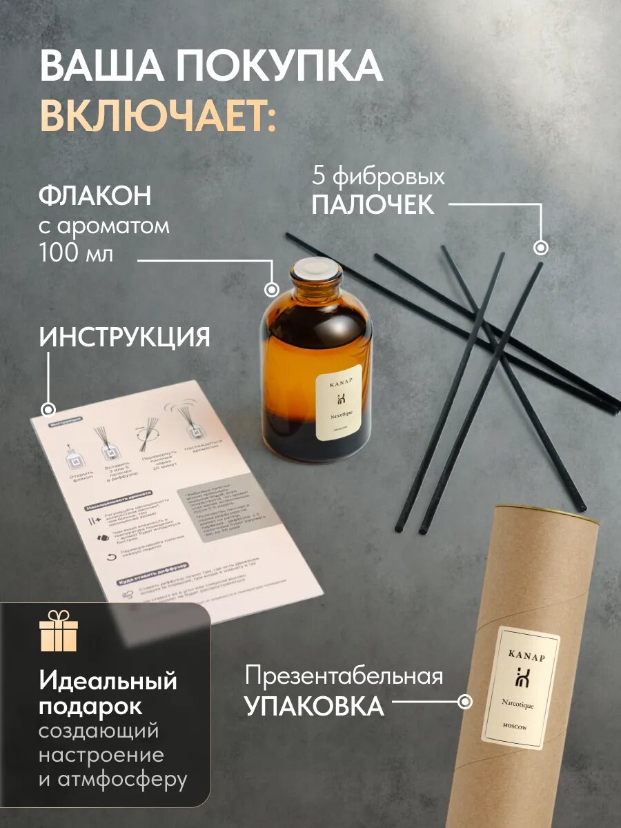 Отзывы на Ароматический диффузор для дома с палочками KANAP 100мл, ароматизатор Narcotique бергамот мускус пион