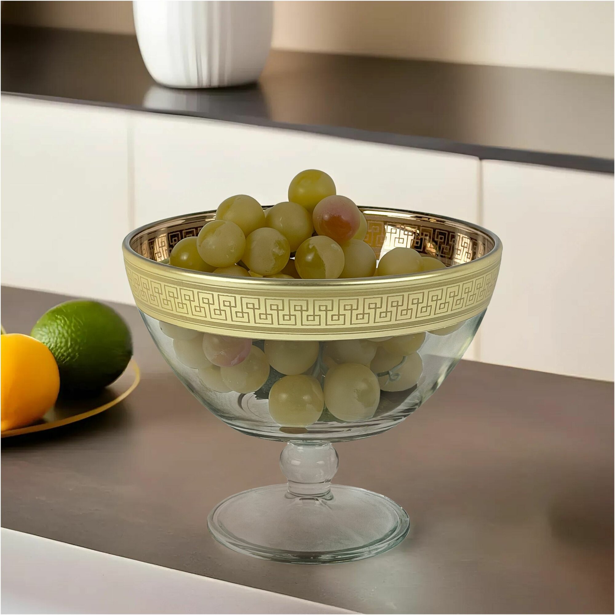 Ваза стеклянная на ножке для фруктов в подарочной упаковке с алмазной гравировкой PROMSIZ греческий узор, 1500 мл,1 шт. 1 092 ₽