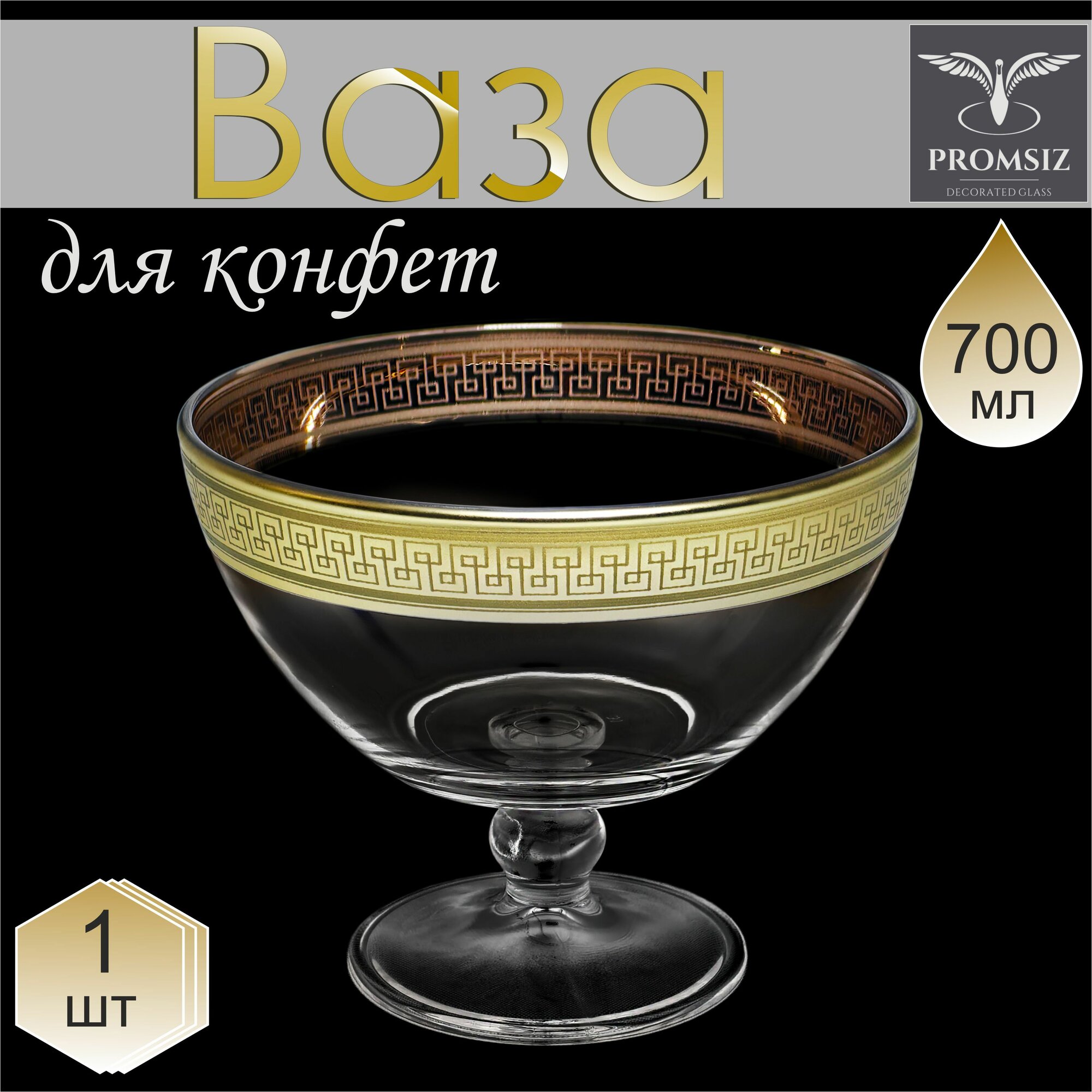 Ваза стеклянная на ножке для конфет в подарочной упаковке с алмазной гравировкой PROMSIZ греческий узор, 500 мл, 1 шт. 814 ₽
