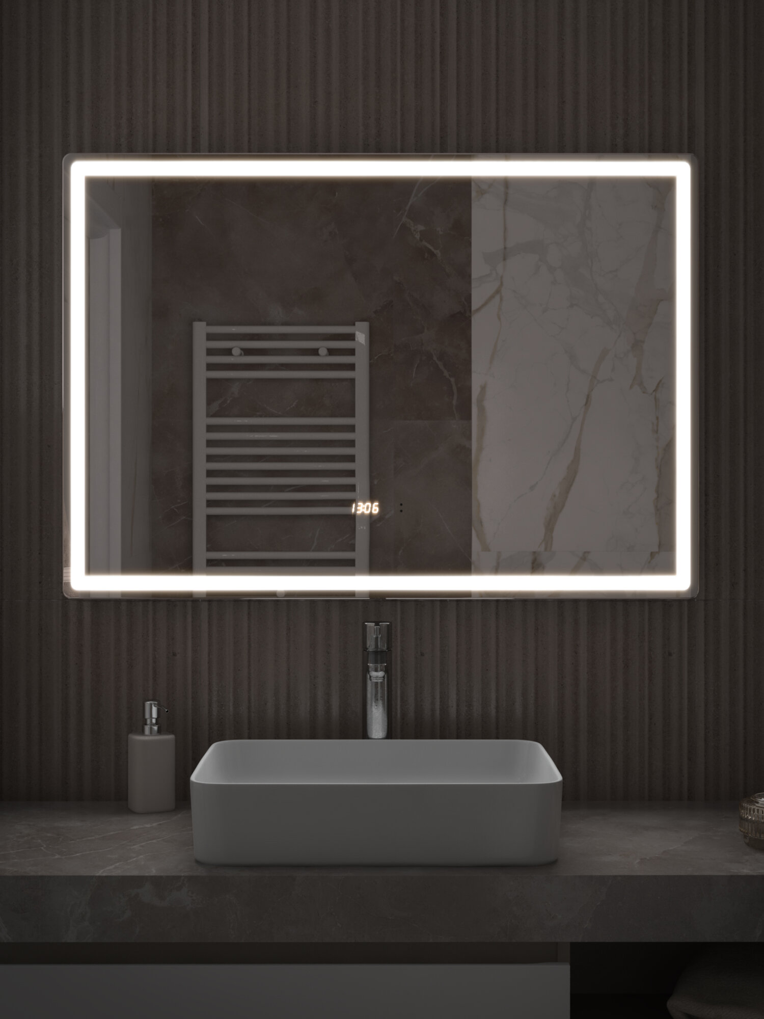 Зеркало с подсветкой в ванную 100 х 70 см Damon Luxe с бесконтактным включением на взмах, подогревом и часами, холодный белый свет 5000К информация: