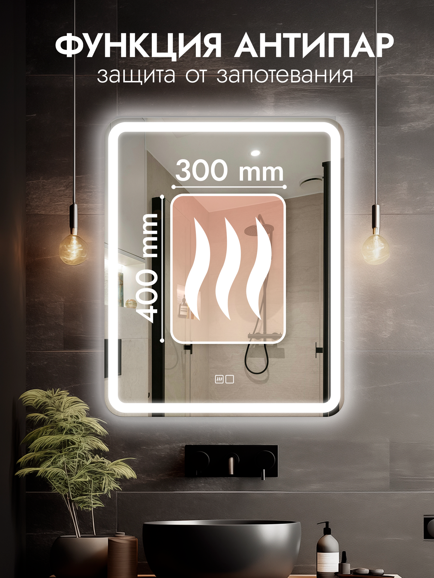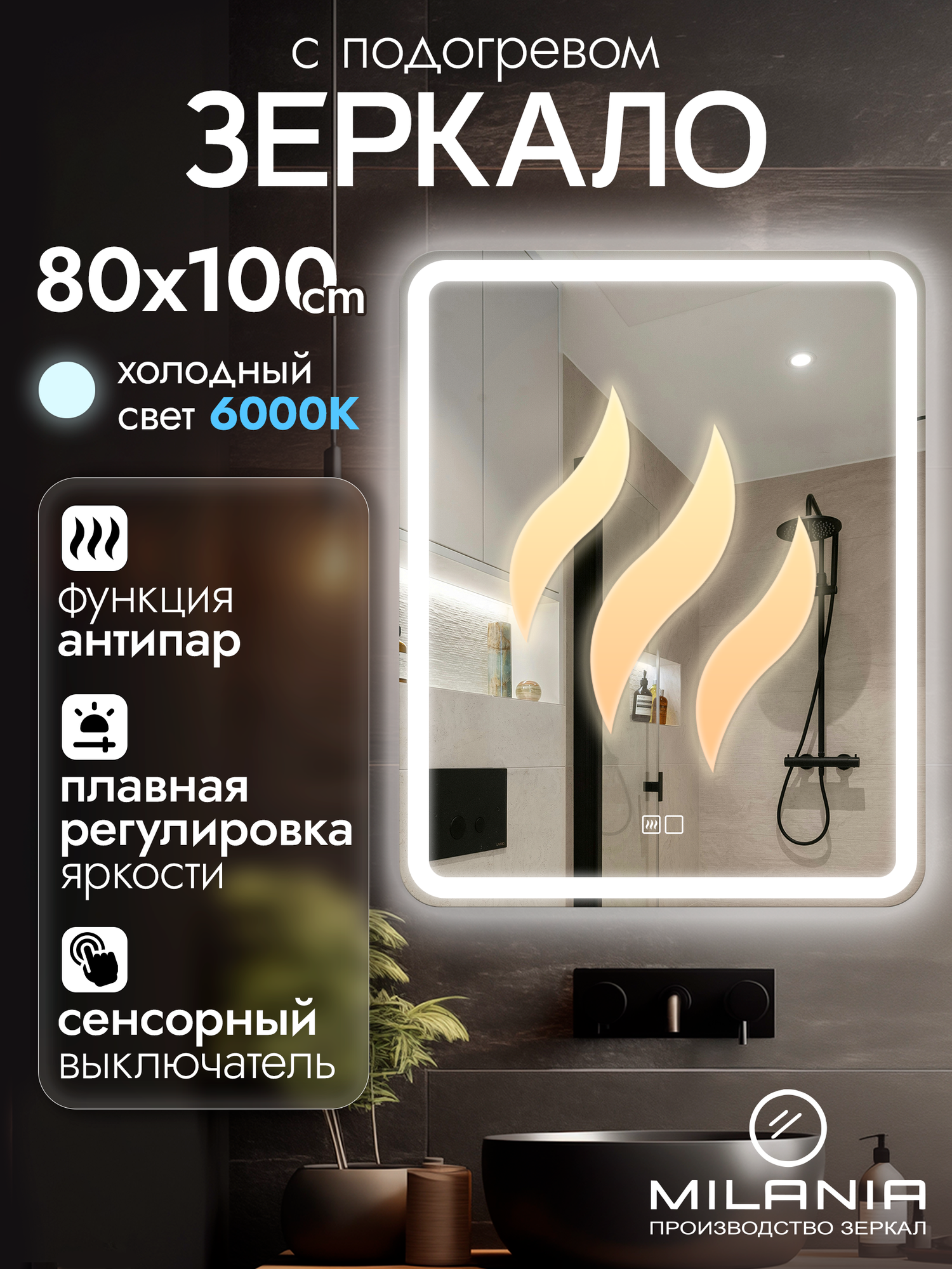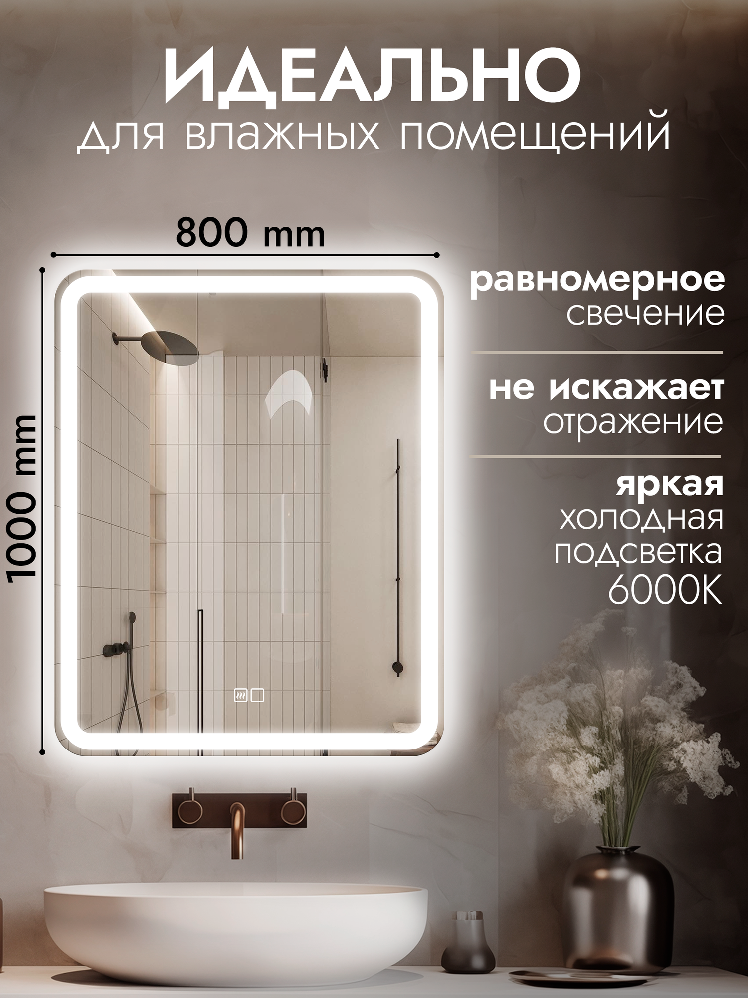Отзывы на Настенное зеркало с подсветкой и подогревом в ванную Laino 80х100 см ореольная подсветка, холодный свет 6000К, сенсорное управление, прямоугольное зеркало для ванной, функция Антипар)
