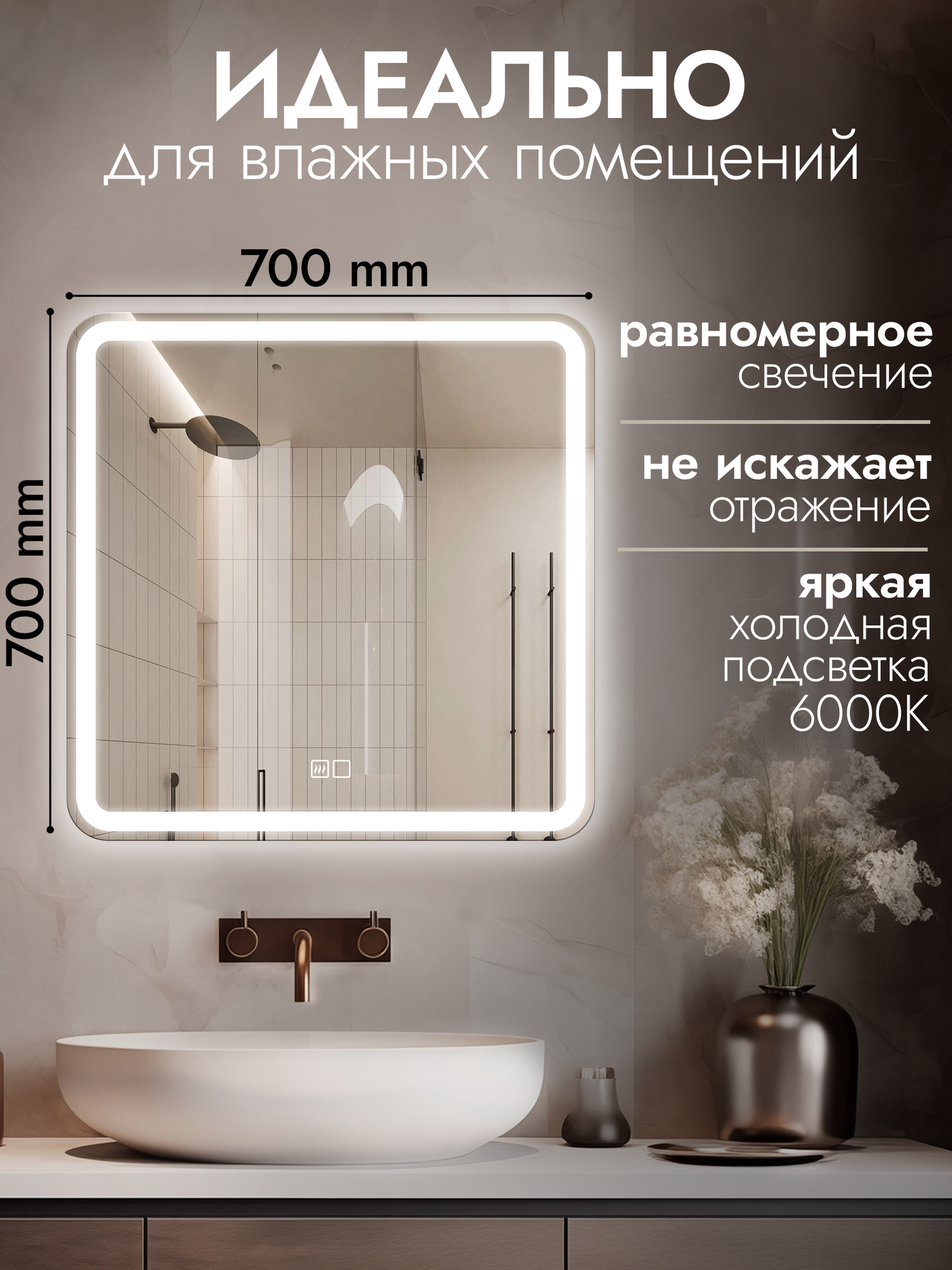 Настенное зеркало с подсветкой и подогревом в ванную Laino 70х70 см (ореольная подсветка, холодный свет 6000К, сенсорное управление, прямоугольное зеркало для ванной, функция Антипар) информация: