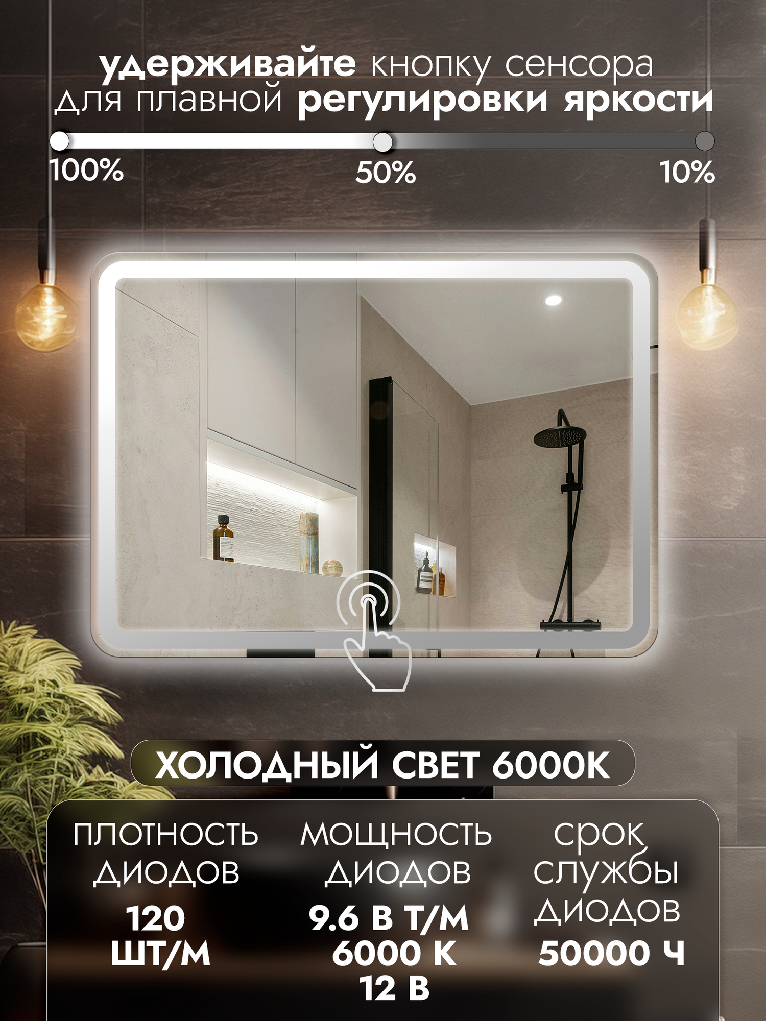 Зеркало настенное для ванной КерамаМане 70*100 см с холодной подсветкой 6000 К с сенсорной кнопкой