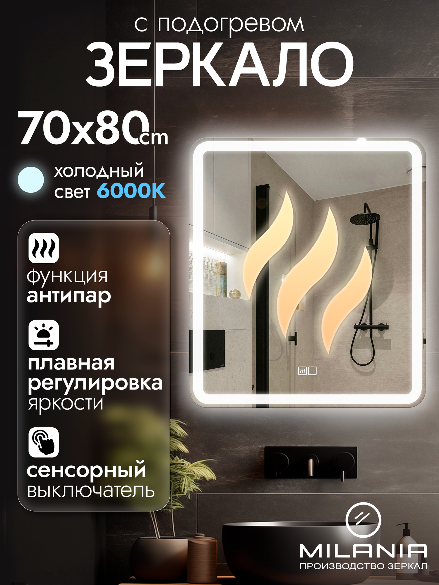 Настенное зеркало в ванную с подсветкой и подогревом laino 70*80 (ореольная подсветка, холодная 6000K, функция Антипар) информация: