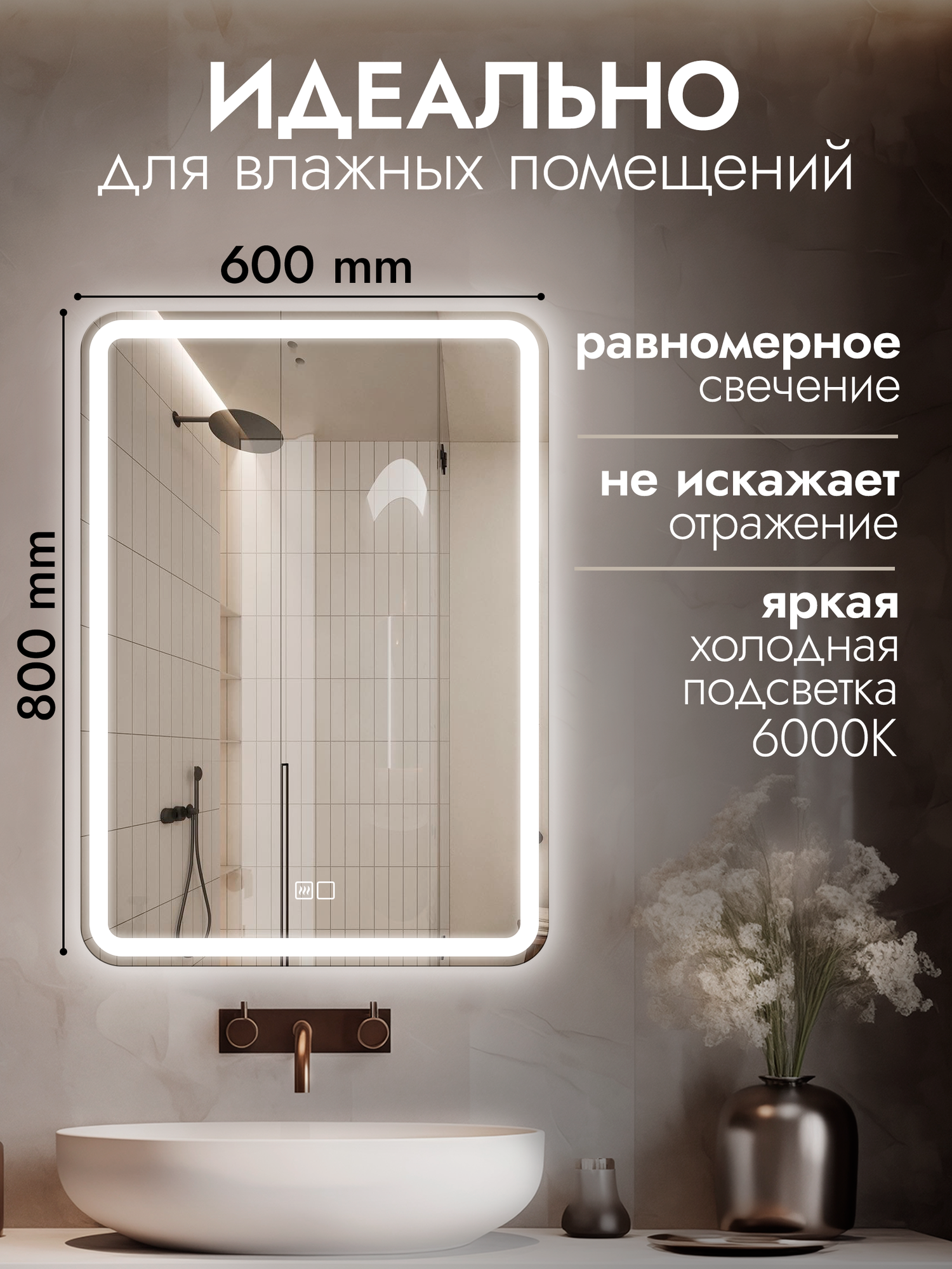 Отзывы на Настенное зеркало с подсветкой и подогревом в ванную Laino 60х80 см (ореольная подсветка, холодный свет 6000К, сенсорное управление, прямоугольное зеркало для ванной, функция Антипар)