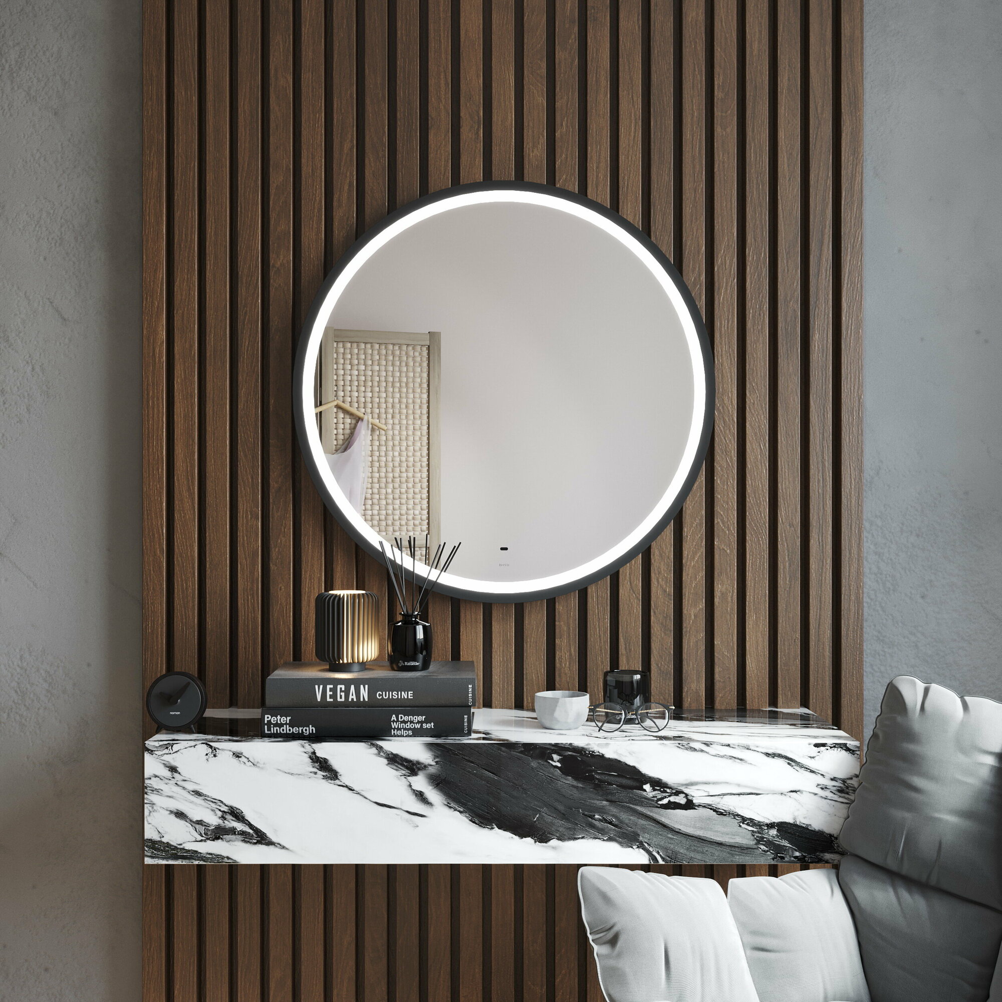 Отзывы на Зеркало круглое 80х80см лофт с LED подсветкой, бесконтактным сенсором и черной рамой BOND M60ZE-8080