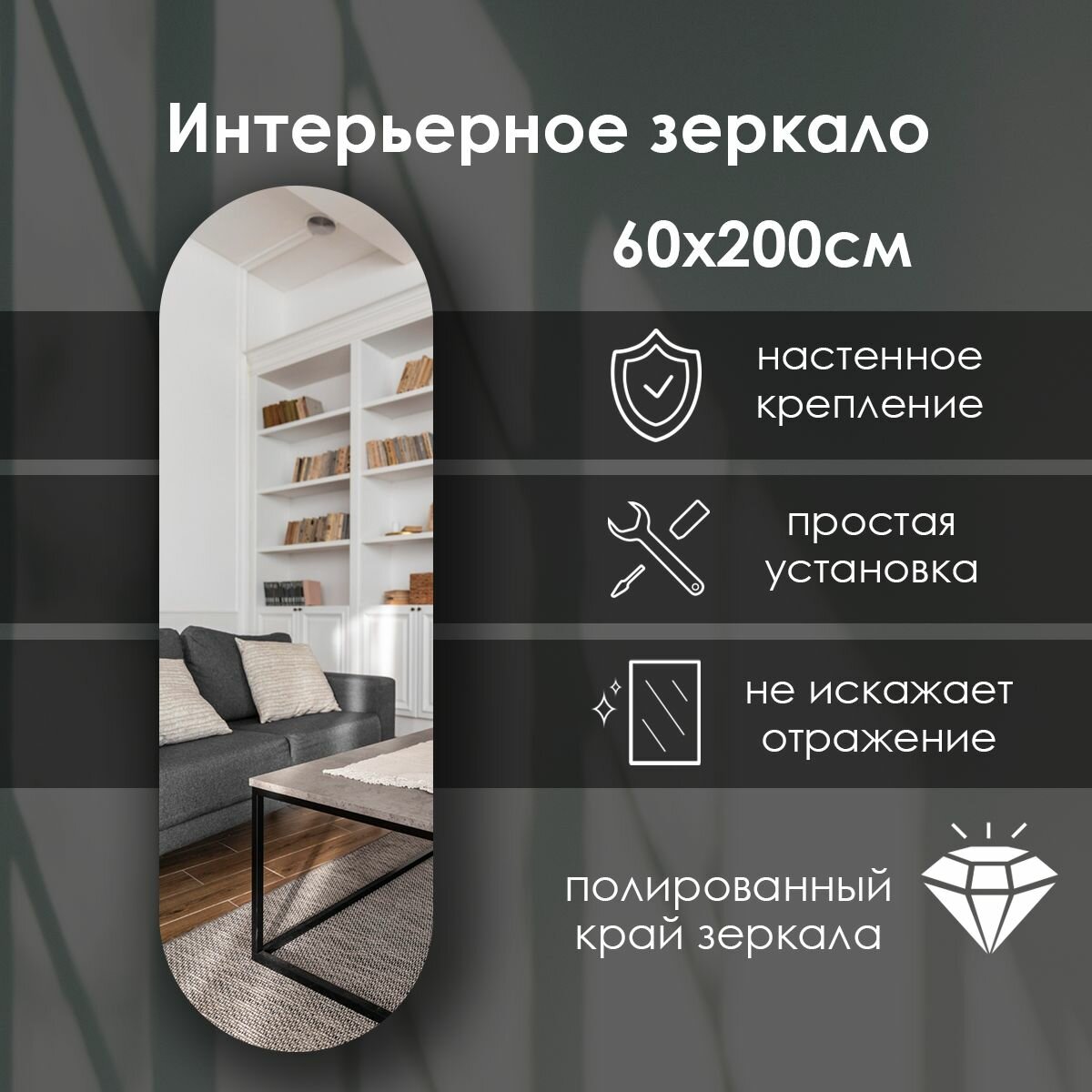 Зеркало интерьерное капсульное 200х60 см информация: