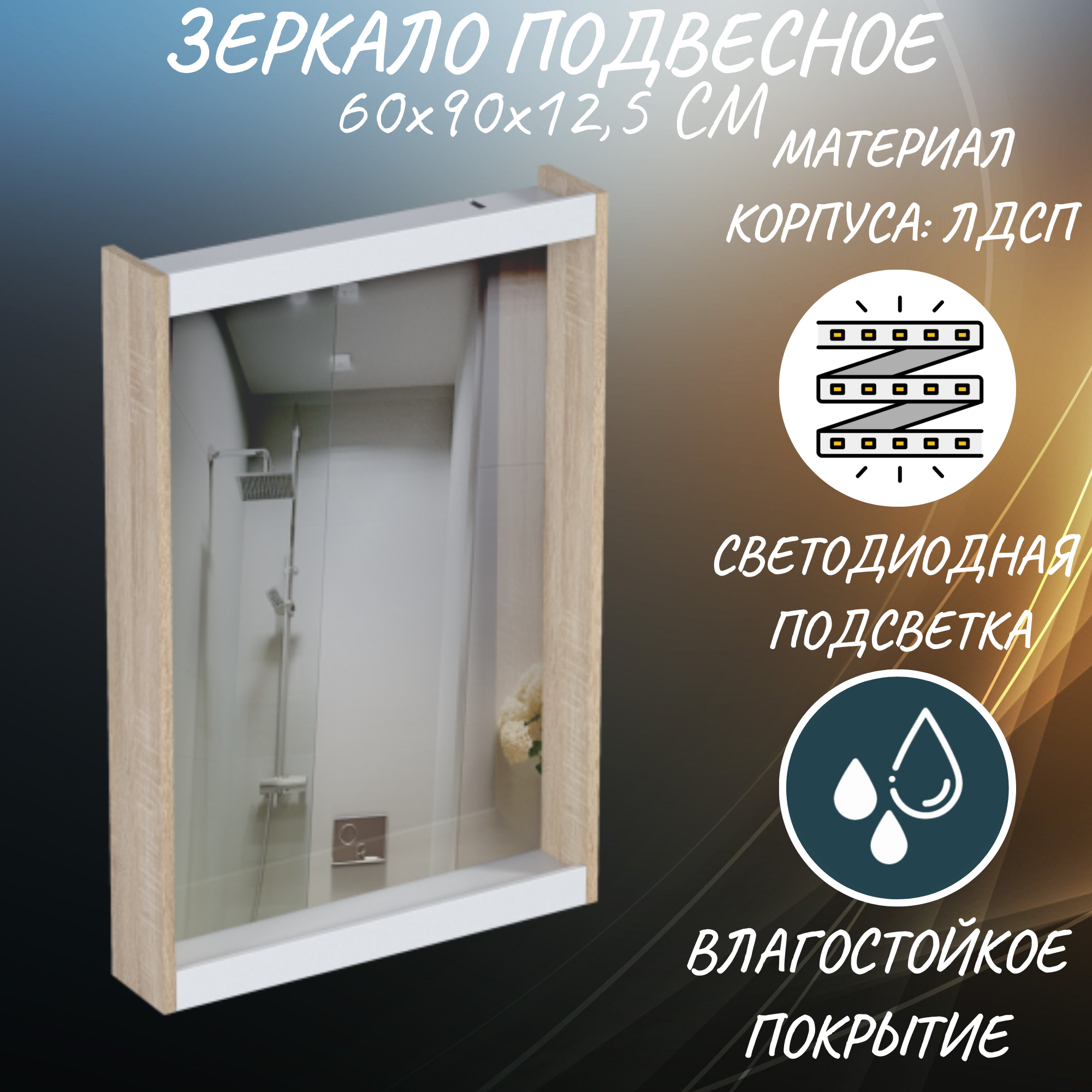 10 цен на Подвесное зеркало с подсветкой в ванную 60х90 см, с полкой, цвет Дуб Сонома, 1Marka Aris У84859МП