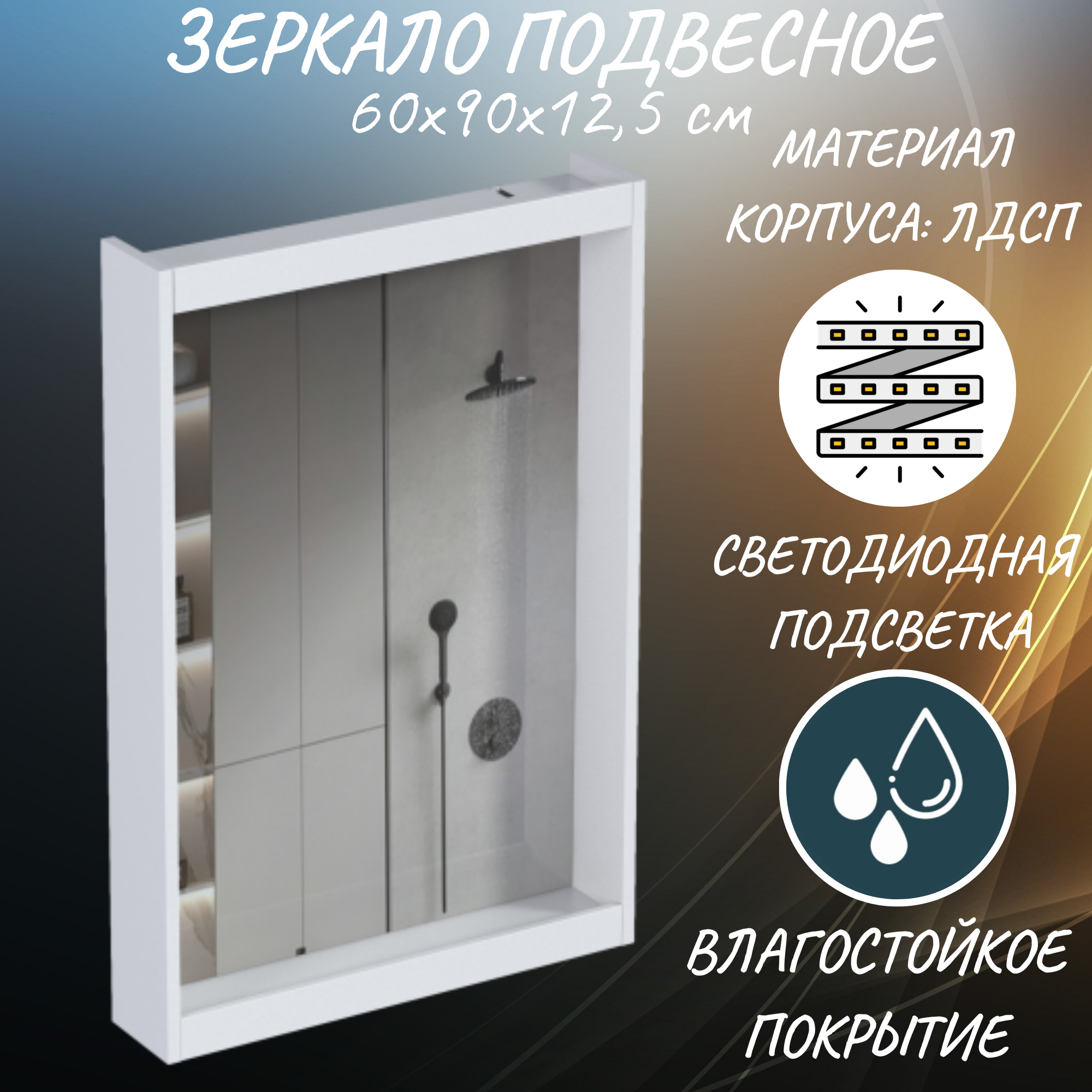 Подвесное зеркало с подсветкой в ванную 60х90 см, с полкой, цвет Белый глянец, 1Marka Aris У83226МП информация:
