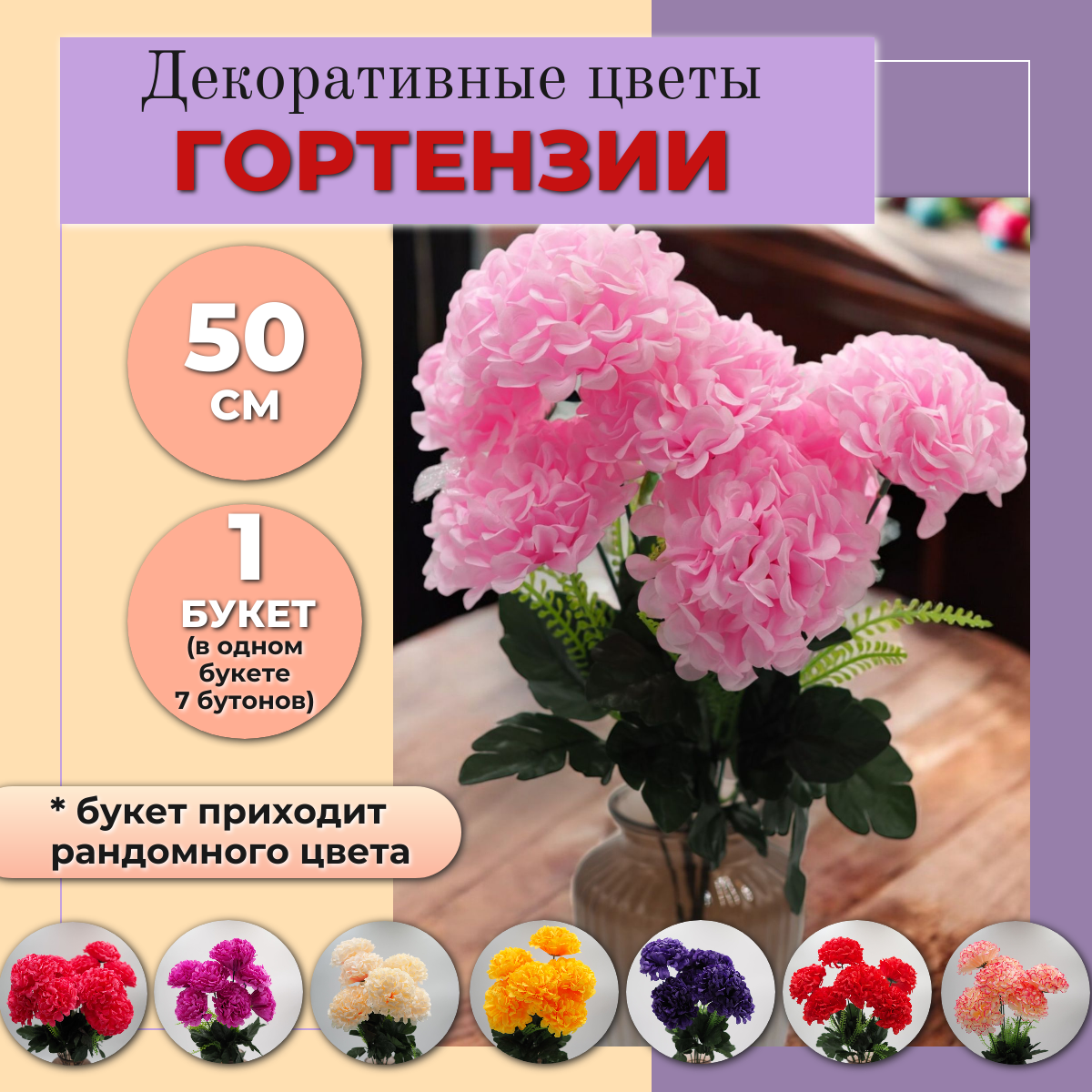 10 цен на Цветы Гортензии (CV16) декоративные, искусственные, интерьерные 1 букет, 50см, микс