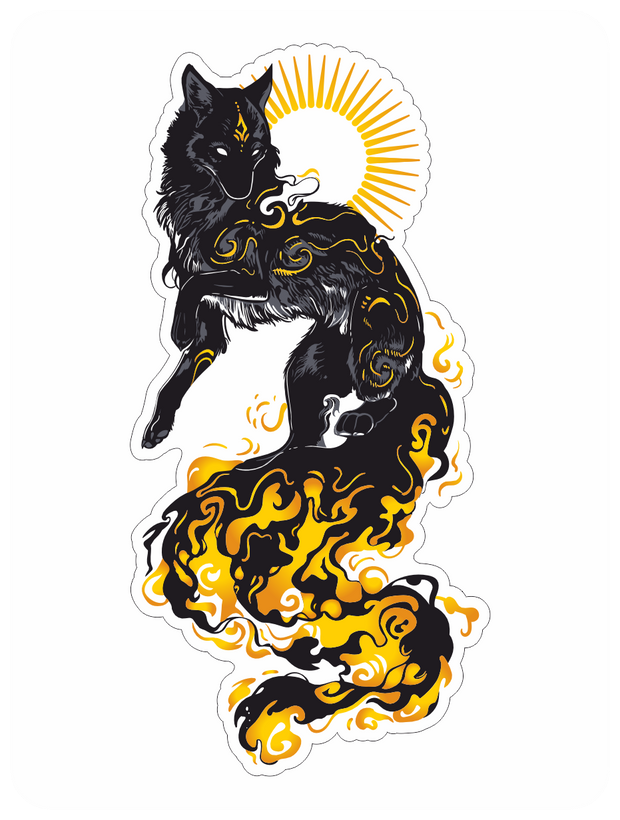 Виниловая наклейка для интерьера "Чёрный волк и огненный хвост / мистический хищник / лис и солнце" информация: