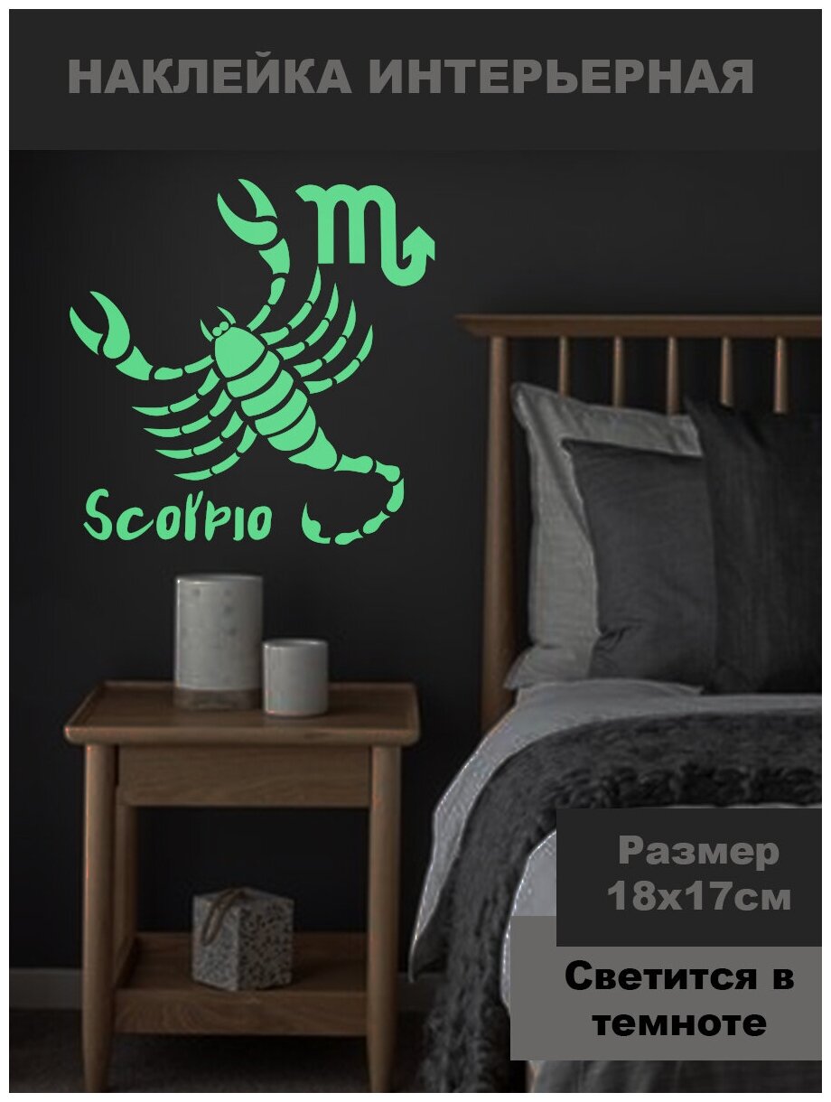 Наклейка светящаяся ' Знак Скорпион ', 18x17см. (водная стихия, паукообразные, восьмой знак зодиака, гороскоп) информация: