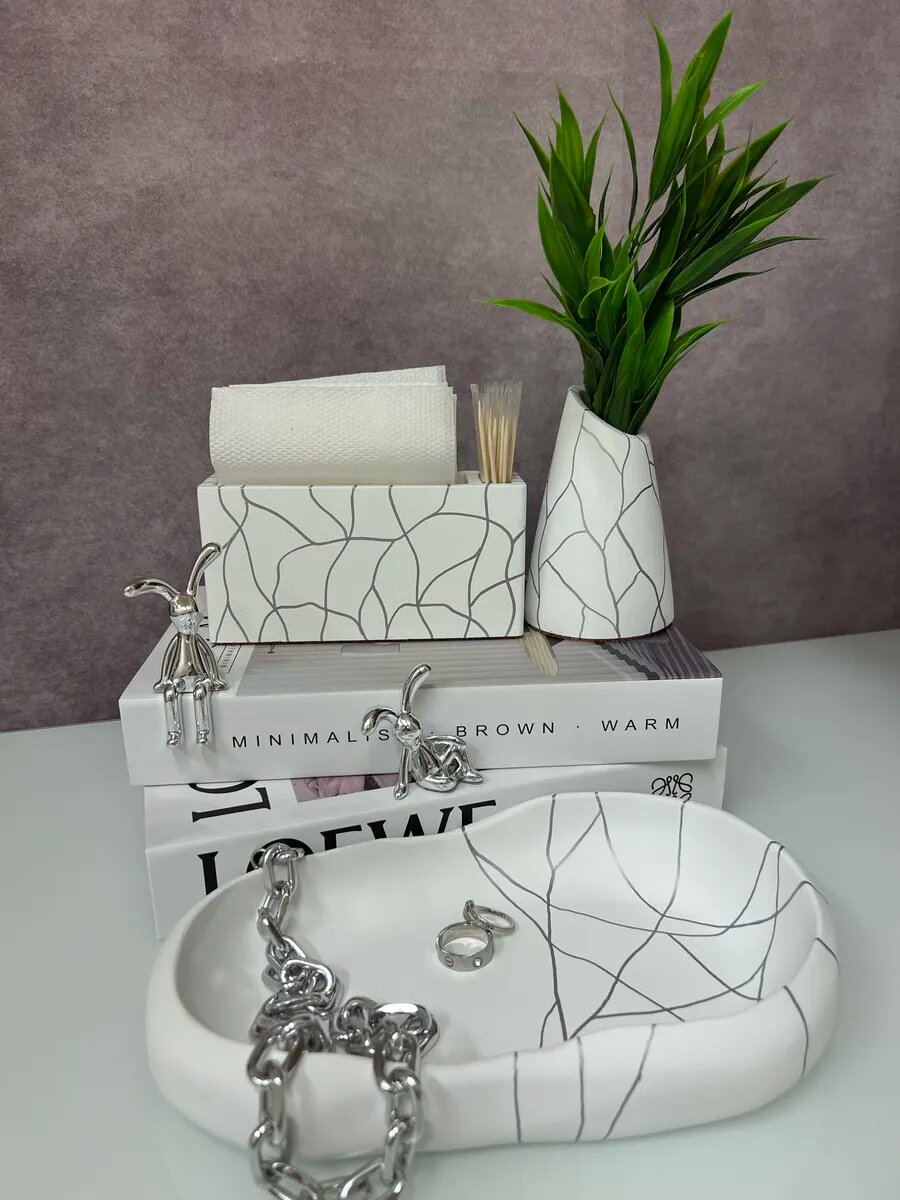 10 цен на Салфетница и ваза белый матовый, серебряный мрамор набор