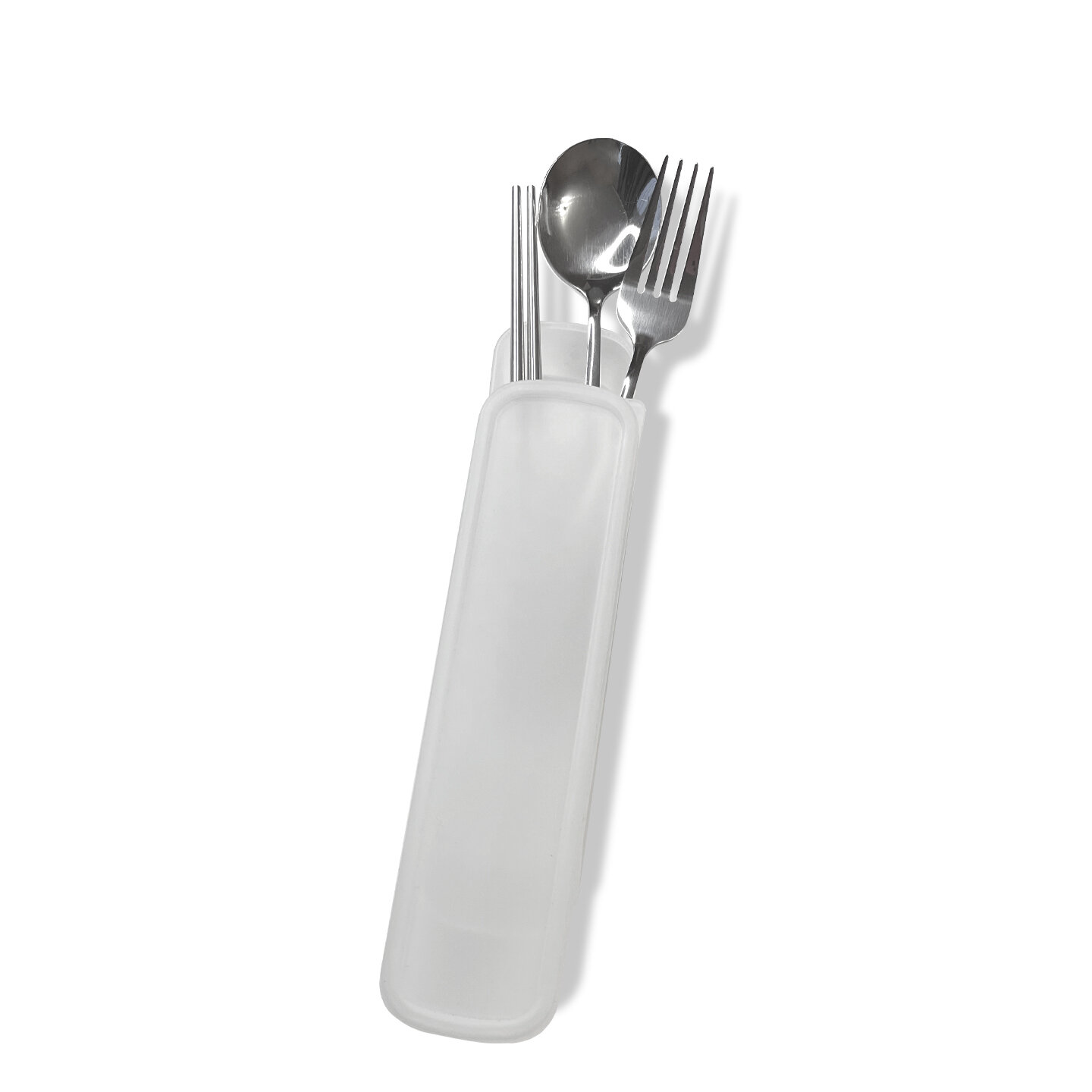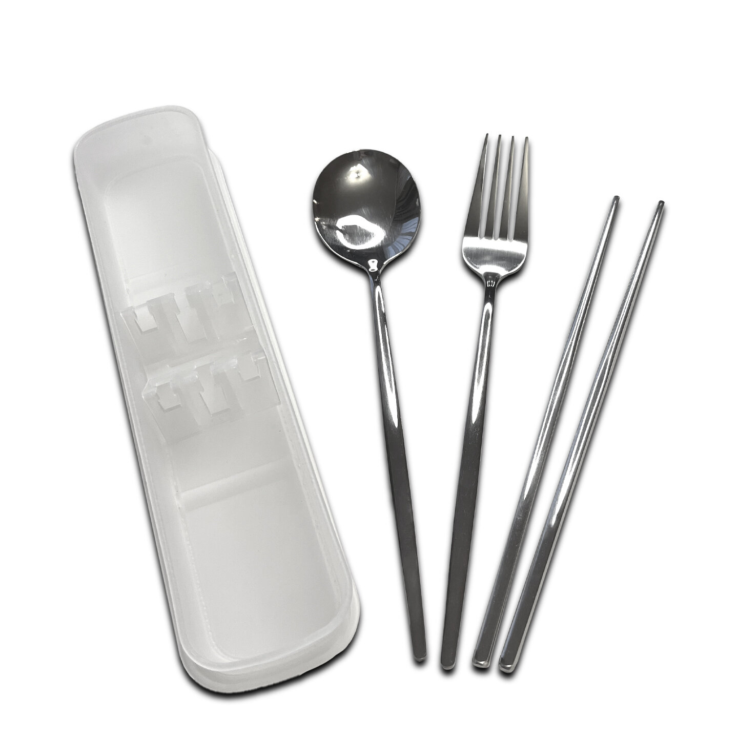 Отзывы на Дорожный набор полноразмерных столовых приборов из 3 предметов (вилка, круглая ложка , китайские палочки), качественный походный набор в футляре, прозрачный