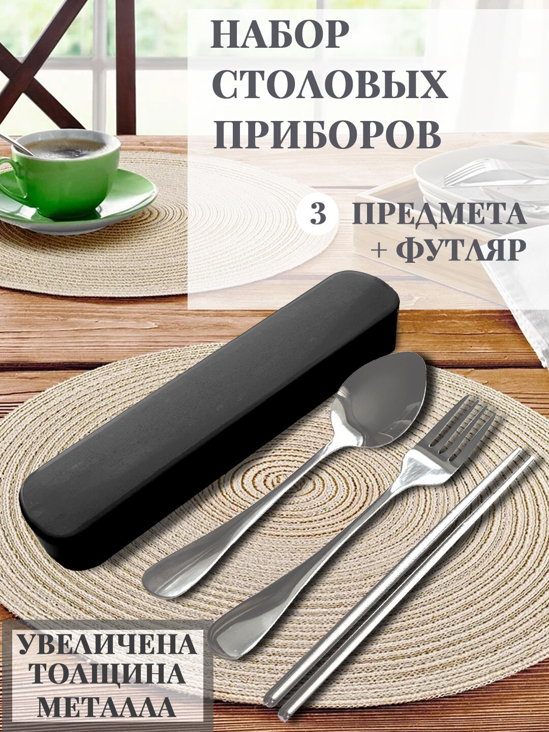 Отзывы на Дорожный набор столовых приборов из 3 предметов (вилка, ложка , китайские палочки), увеличена толщина металла, черный