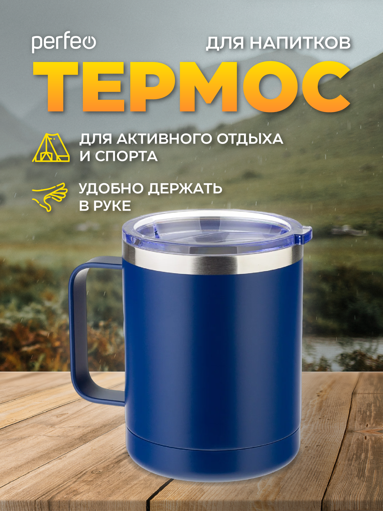 10 цен на Термокружка PERFEO для напитков с прозрачной крышкой, ручкой, объем 0,35 л, темно-синий (PF_C3732)