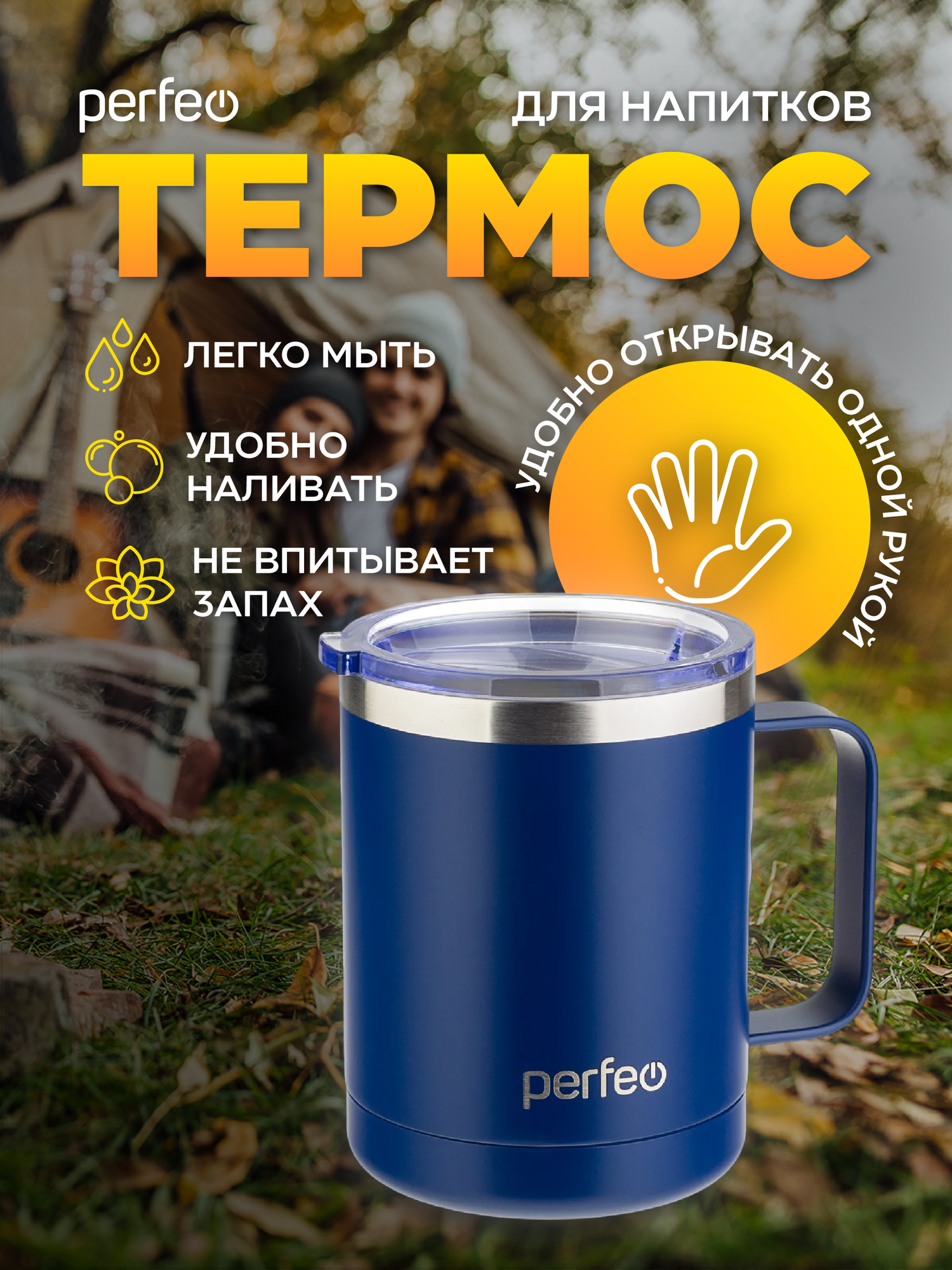 Отзывы на Термокружка PERFEO для напитков с прозрачной крышкой, ручкой, объем 0,35 л, темно-синий (PF_C3732)
