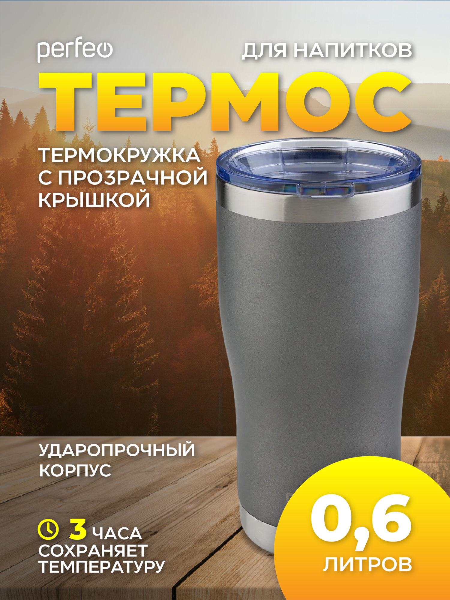 Термокружка PERFEO для напитков с прозрачной крышкой, объем 0,6 л, серый (PF_C3725) информация: