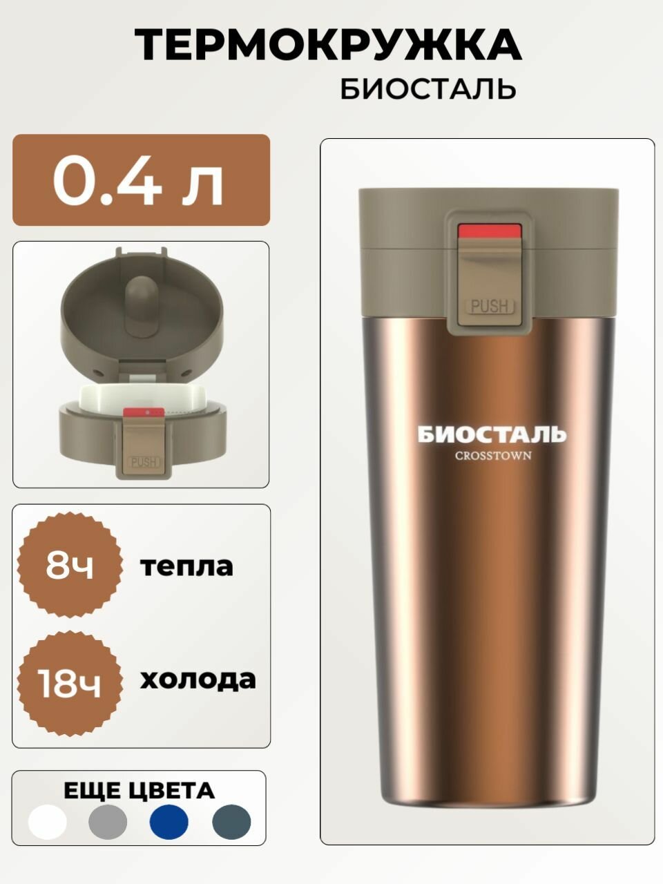Термос-кружка Biostal (Биосталь) Crosstown 400 мл. (0,4 л) походная для кофе / Biostal с двойными стенками / кружка информация: