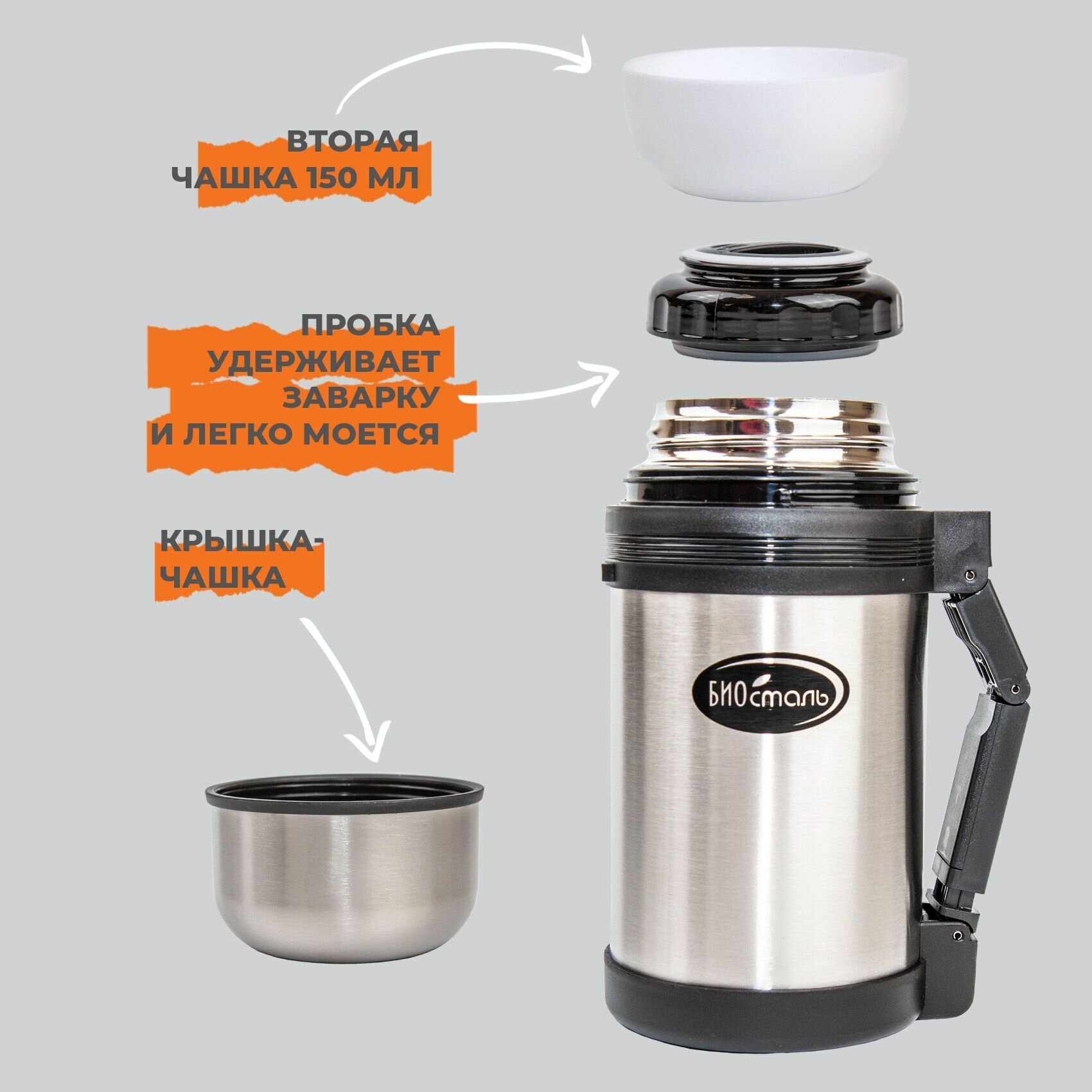 Термос 1.8 литра Биосталь - туризм универсальный, для еды и напитков, две чашки, ручка для переноски, (1800 мл) Biostal информация: