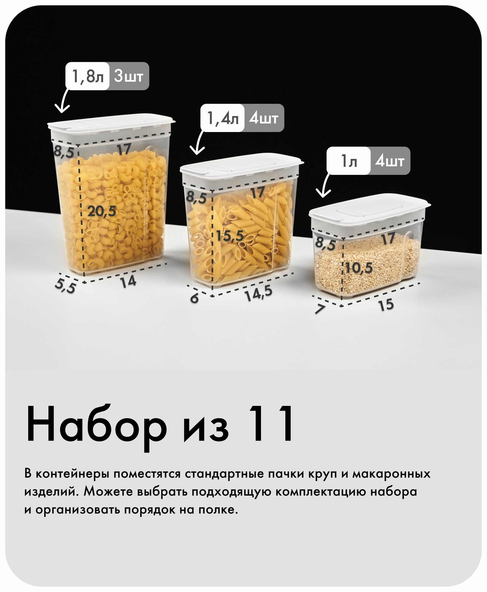 Набор контейнеров для сыпучих продуктов №103 (1,0л 4шт; 1,4л 4шт; 1,8л 3шт) (11шт) (серый) информация:
