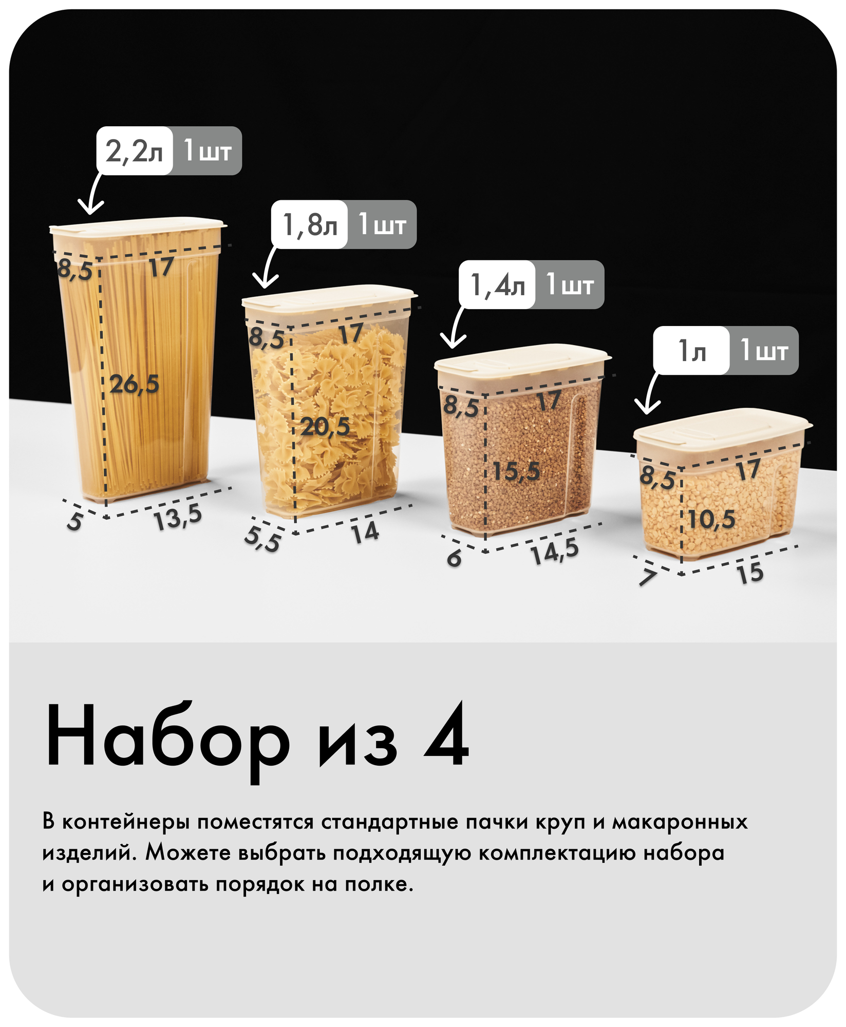 Набор контейнеров для сыпучих продуктов №31 (1,0л×1шт; 1,4л×1шт; 1,8л×1шт; 2,2л×1шт) (4шт) (слоновая кость) информация: