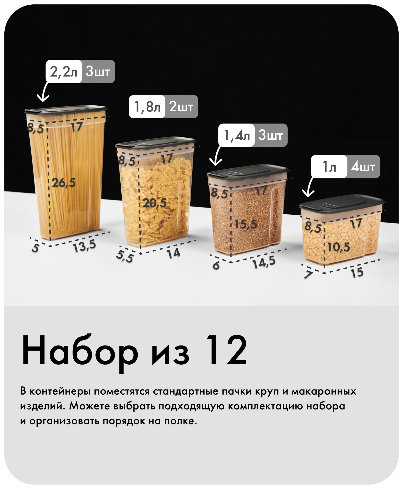 Набор контейнеров для сыпучих продуктов №36 (1,0л×4шт; 1,4л×3шт; 1,8л×2шт; 2,2л×3шт) (12шт) (графит) информация: