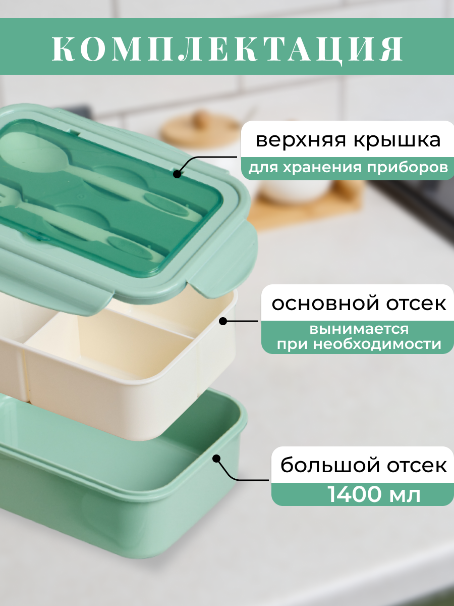 10 цен на Ланч-бокс "Школьный", герметичный, 1764мл, пластик, зелёный, с разделителями