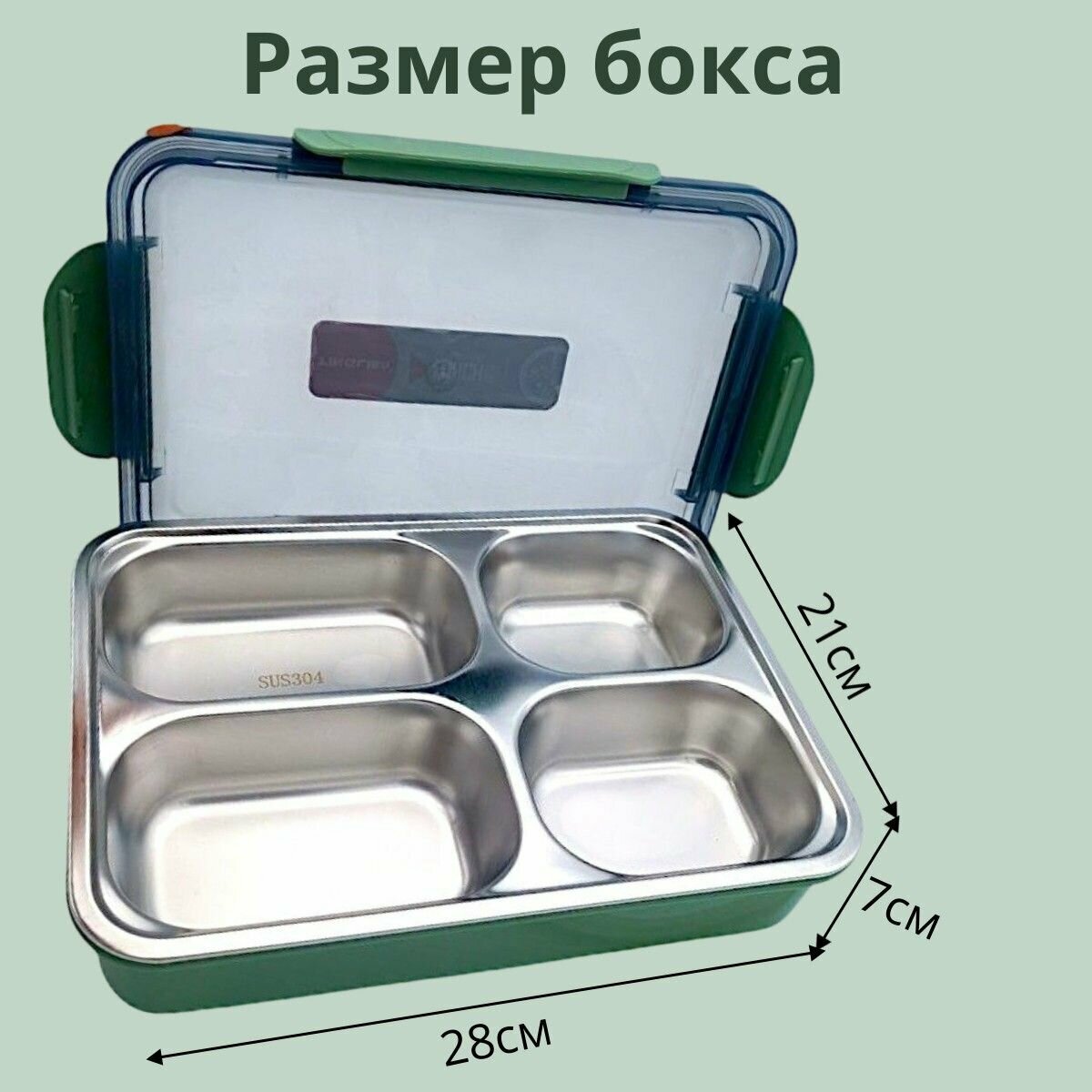 Ланч бокс контейнер для еды с 4 секциями - зеленый , 28х21х7 / металлический информация: