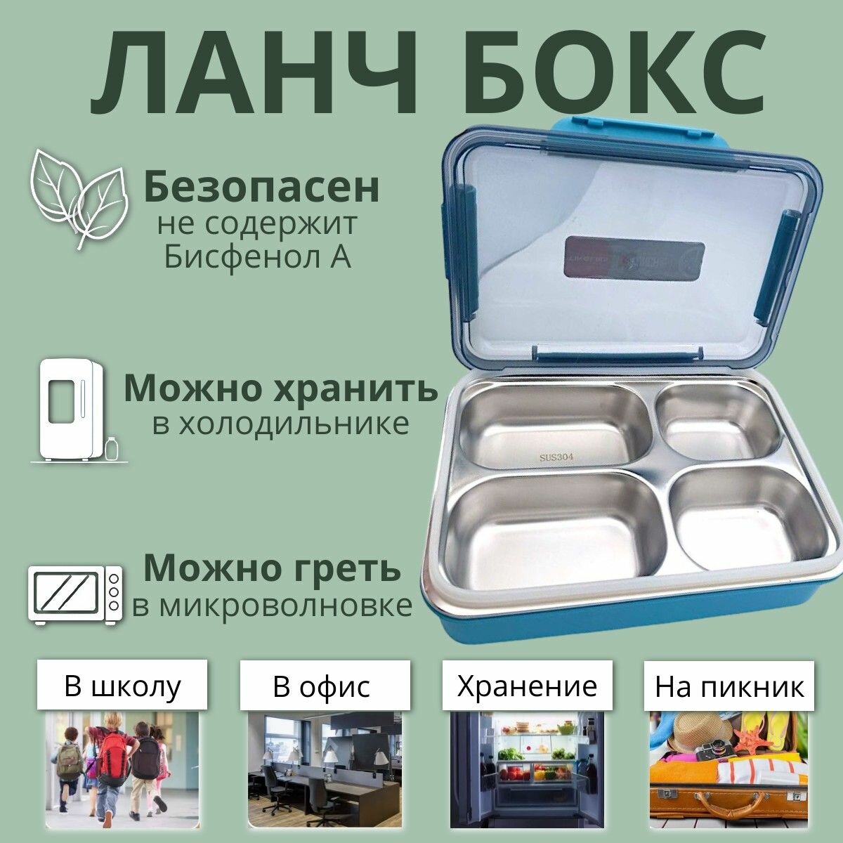 Ланч бокс контейнер для еды с 4 секциями - зеленый , 28х21х7 / металлический 2 398 ₽