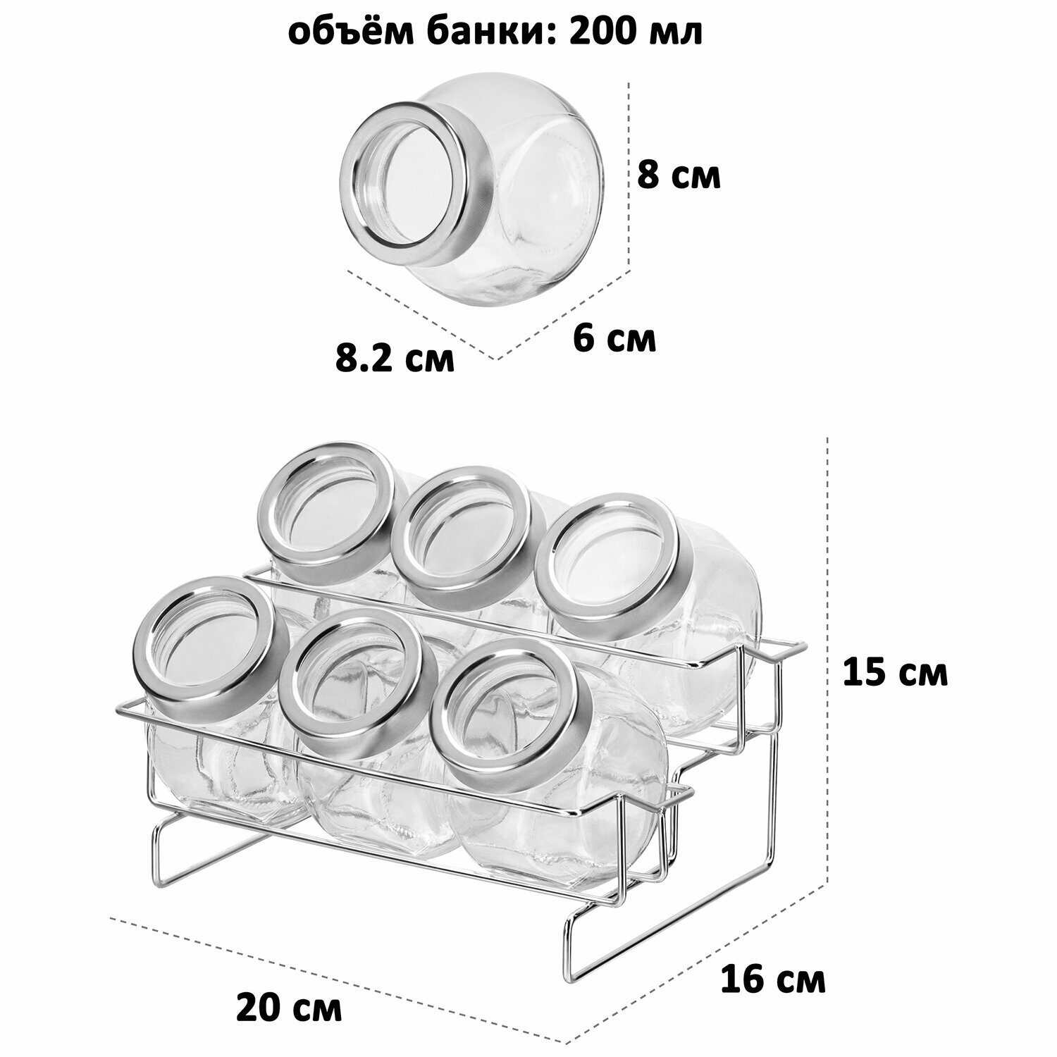 Банка для хранения сыпучих продуктов 6 шт по 200 мл Elan Gallery, с метал. крышками, на метал. подставке, стекло, набор информация: