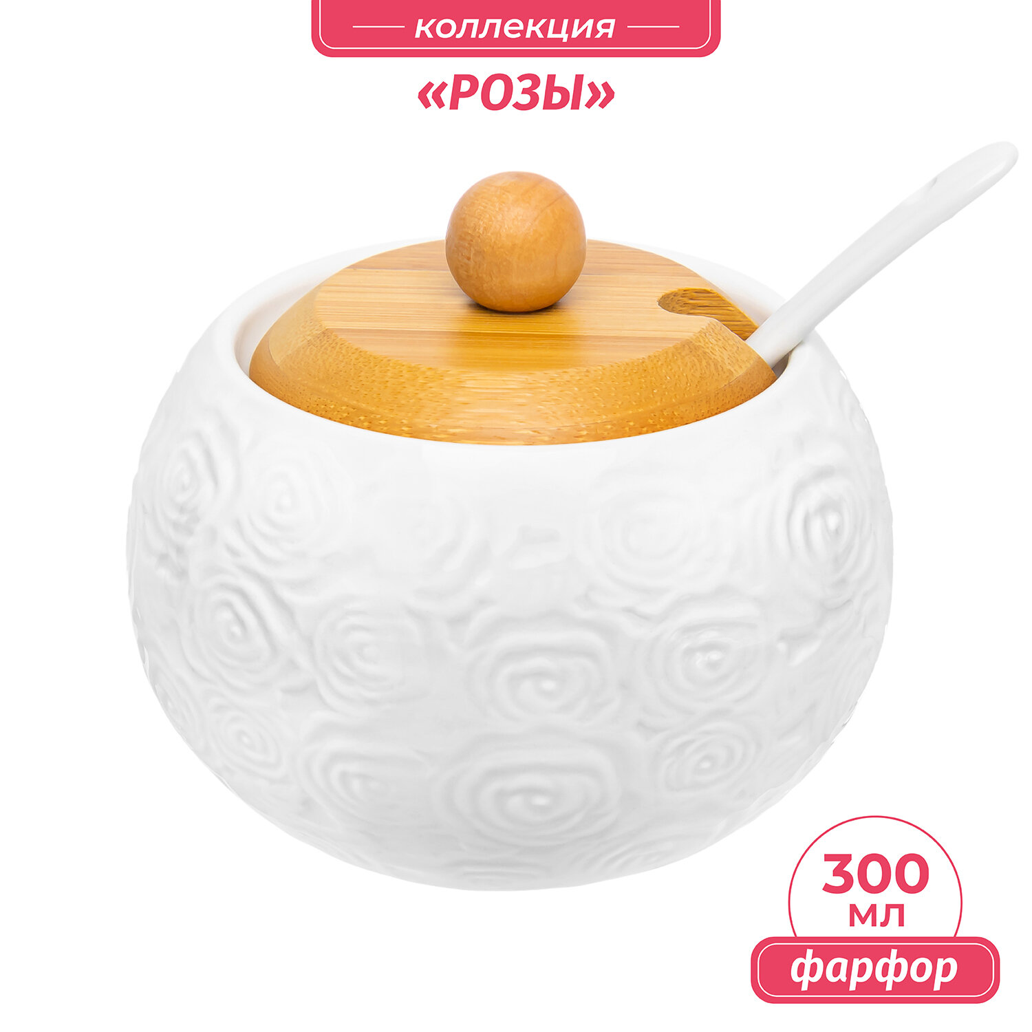 Банка для хранения сыпучих продуктов, соли, специй 250 мл Elan Gallery Розы с деревянной крышкой, с ложкой информация: