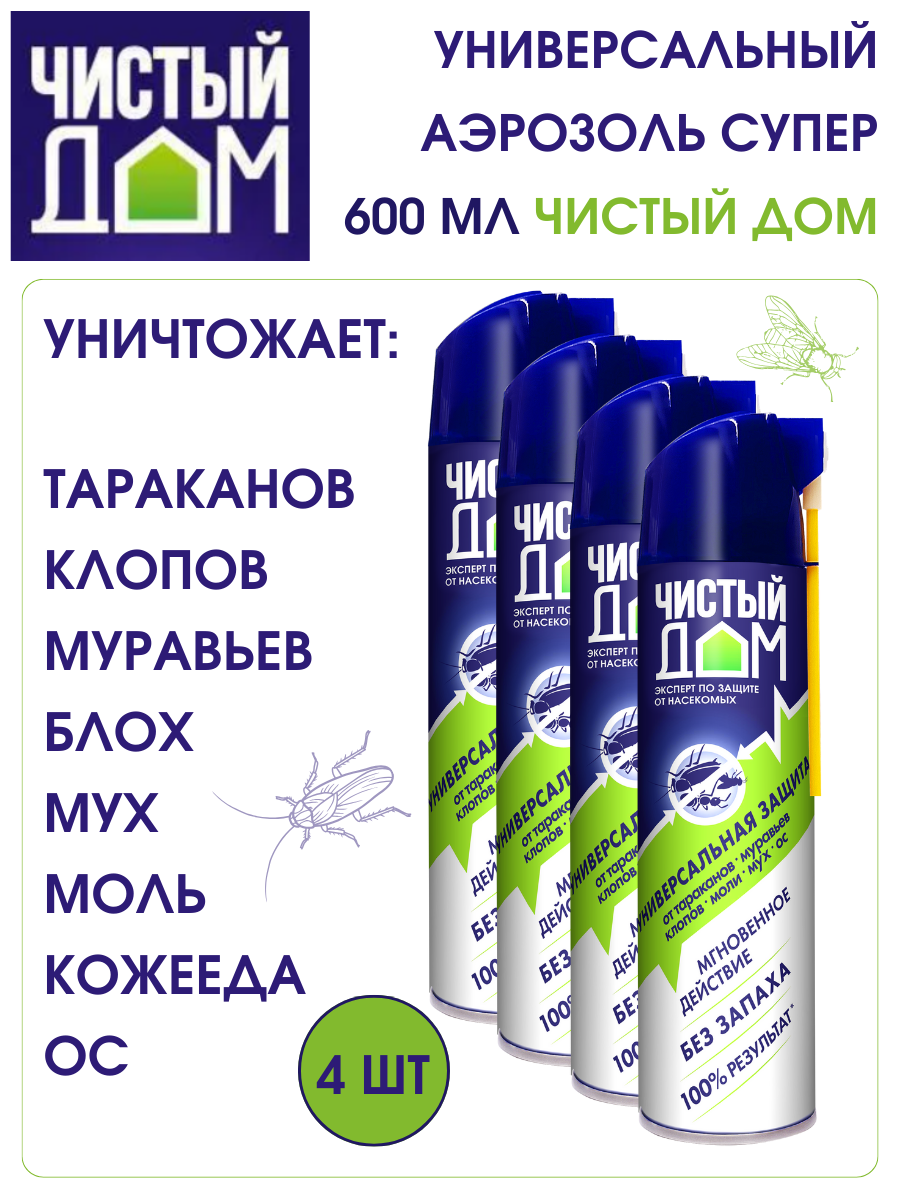 Аэрозоль от тараканов, муравьев, клопов, моли, мух, ос, 600 мл, 4 штуки информация: