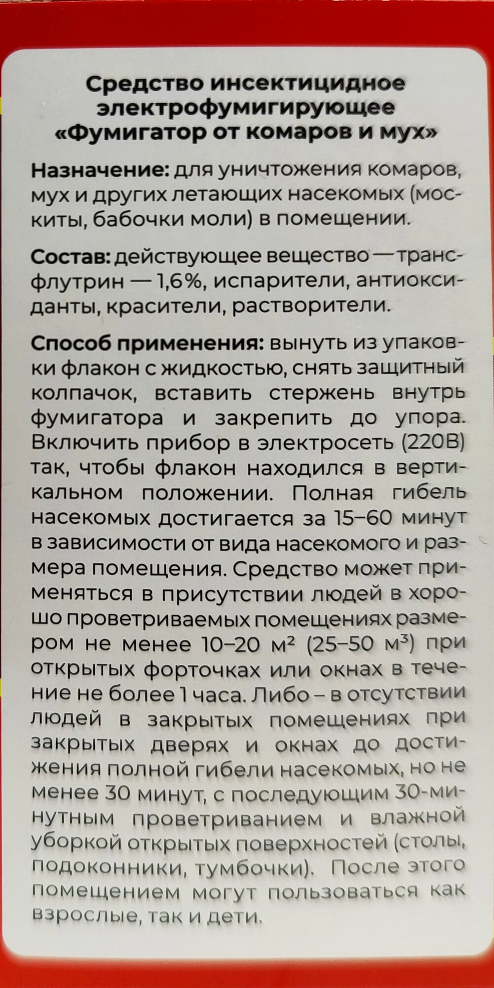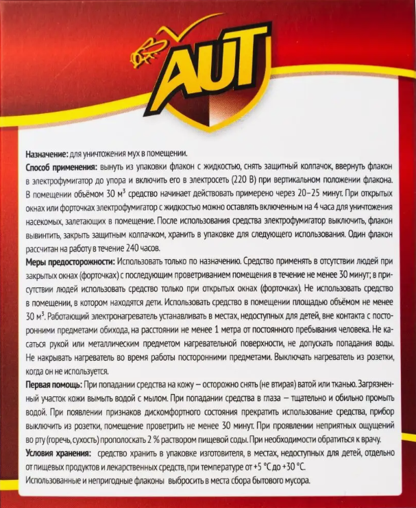 Жидкость для фумигаторов "АУТ", от мух, ос и комаров, 30 дней информация:
