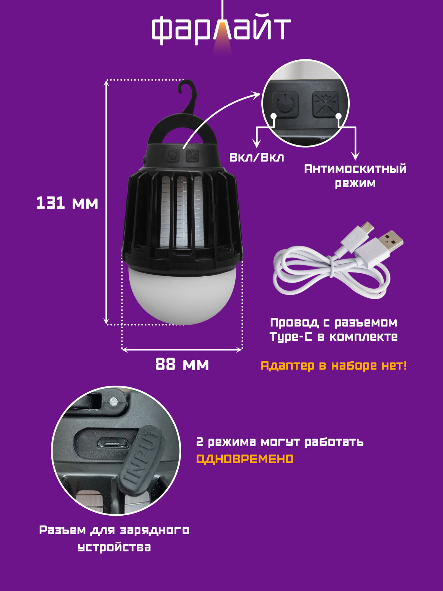 Антимоскитная лампа-ловушка от комаров для дома и улицы Фарлайт, с аккумулятором с подсветкой, IP65, 6000 К, 24-120 Лм 2 202 ₽