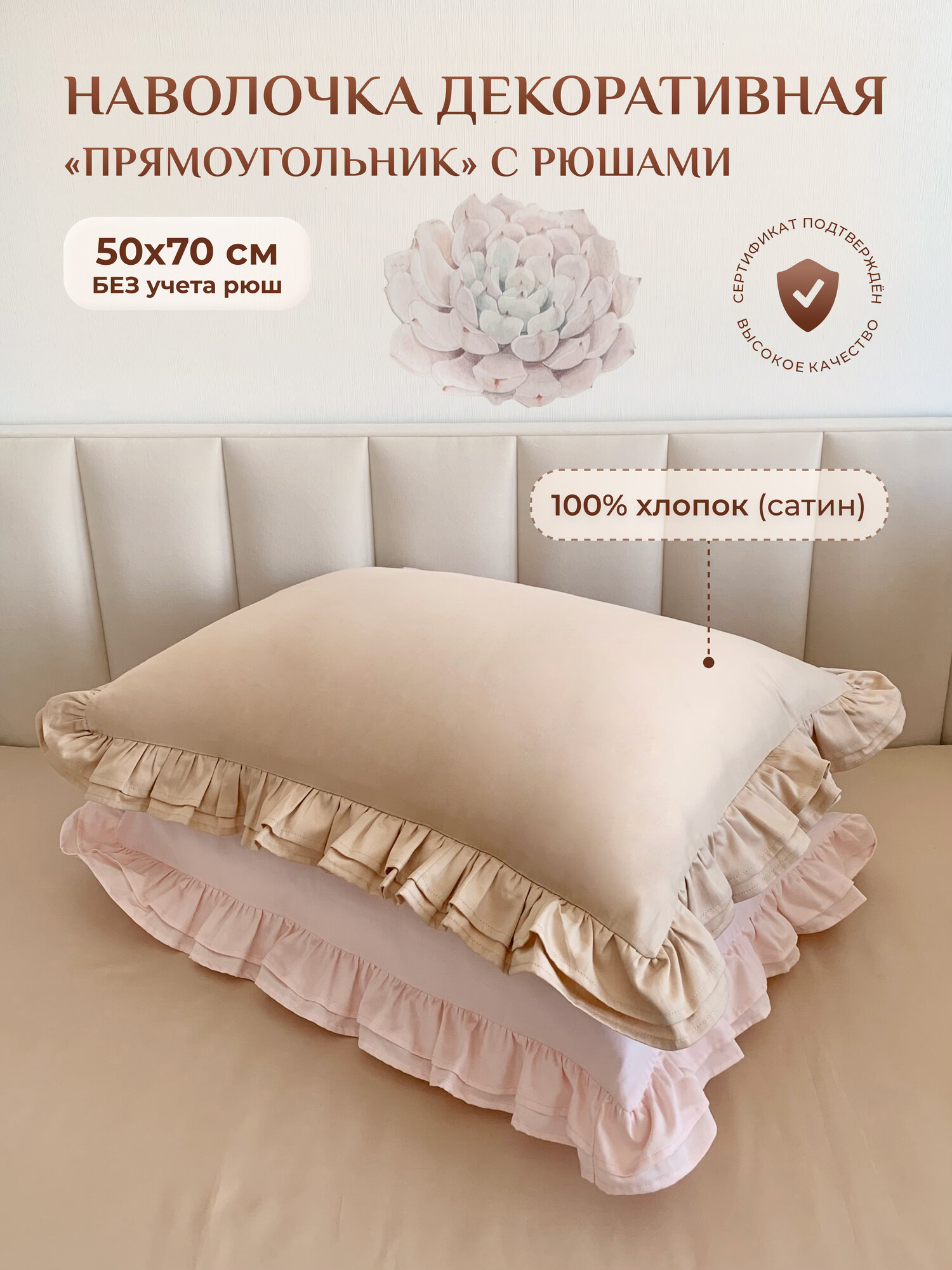 Декоративный чехол (наволочка) с рюшами, 40х60 см, сатин - бежевый информация: