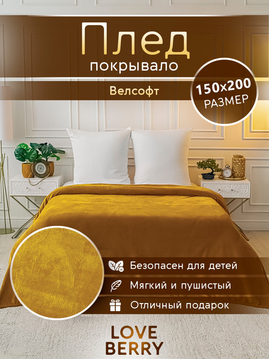 Отзывы на Плед 150х200 см LOVEBERRY из велсофта, однотонный, золотая пальма, подарок маме