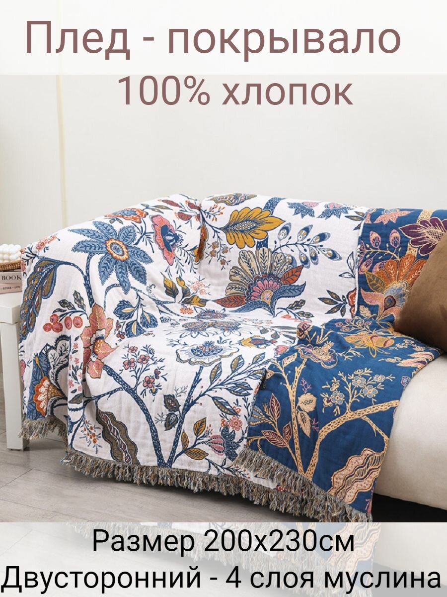 Плед - покрывало YENLN, муслин, 200x230 см, 100% хлопок, двухсторонний с бахромой информация: