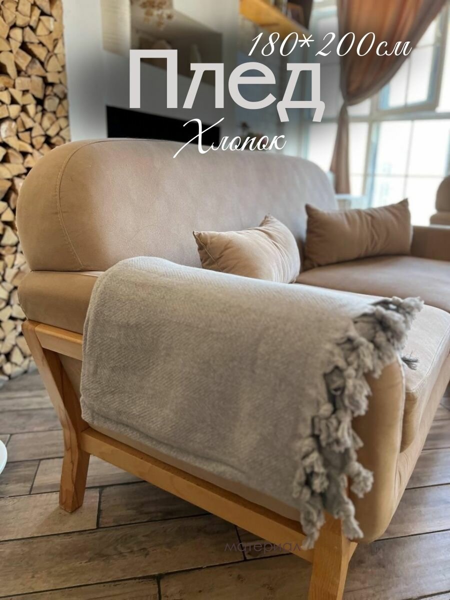 Плед из хлопка двуспальный, 180*200см, теплый с бахромой на диван и кровать, Beige 2 293 ₽